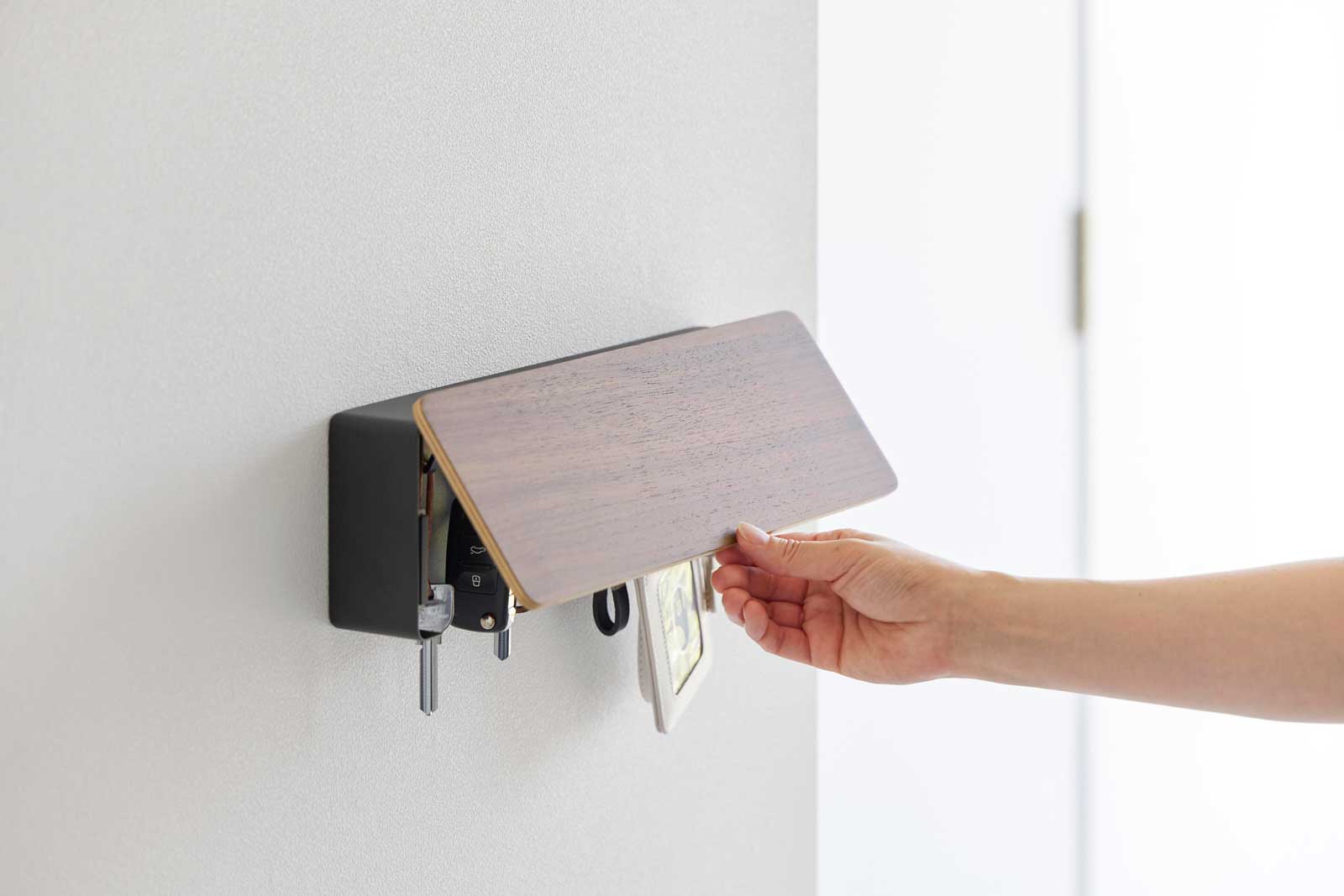 石こうボードピンで簡単に取り付けできる扉付きキーフックです。スリムな奥行きで玄関の壁面やリビングなどに取り付けても場所を取らず、すっきり設置できます。本体下があいているので、鍵の長さを気にせず収納可能で、キーケースやICカードケースも掛けられて便利です。