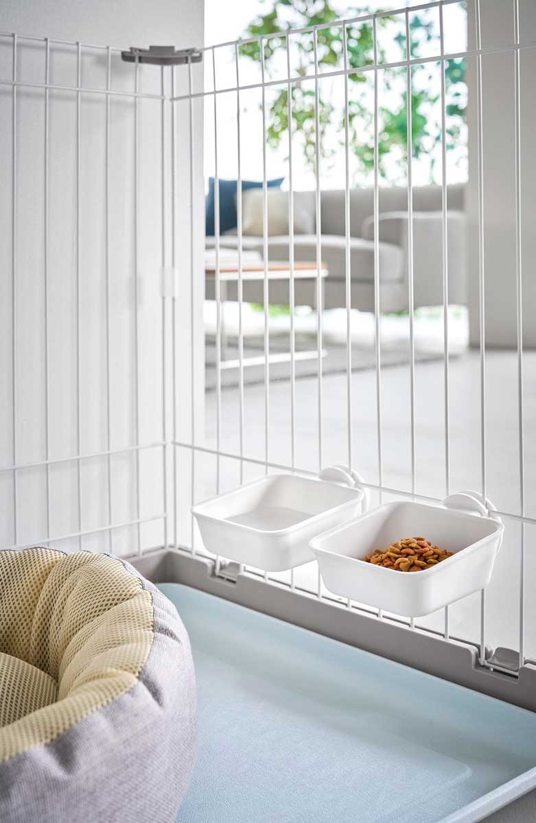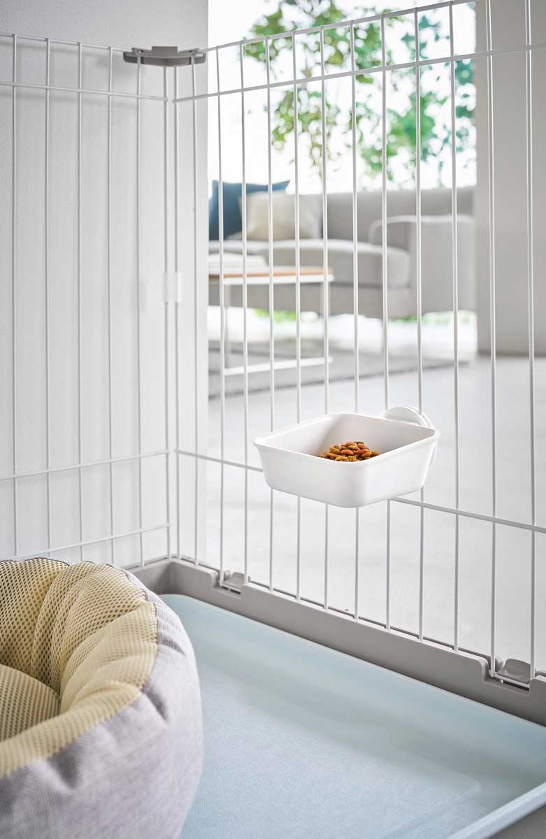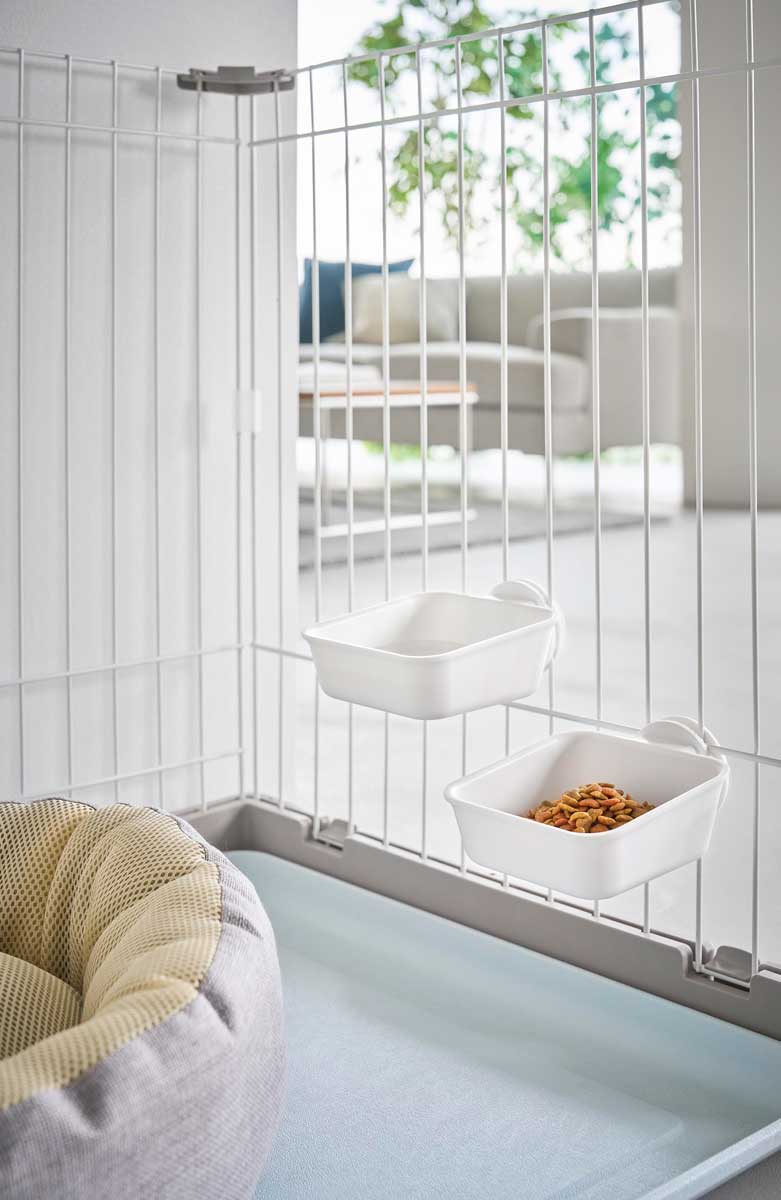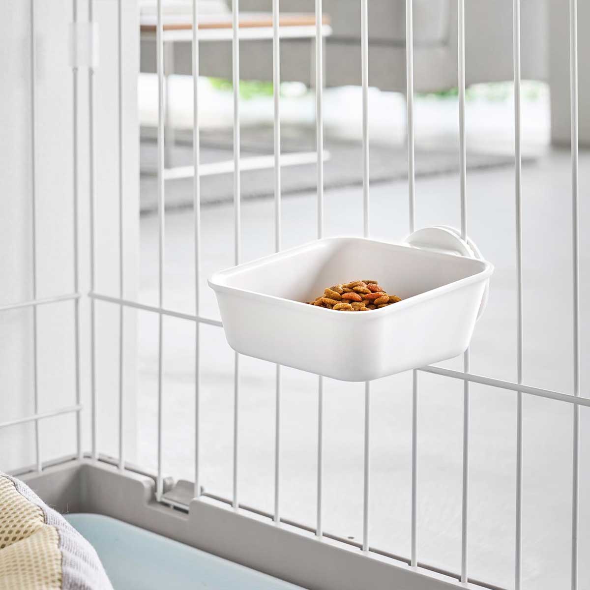 ペットケージの柵に取り付けられるフードボウルです。高さ調節がしやすく、ペットが食べやすい位置に合わせられるので、体への負担を軽減できます。ボウルのみを取り外せるので食べ残しなどの片付けがしやすく、水やフードの交換もスムーズです。