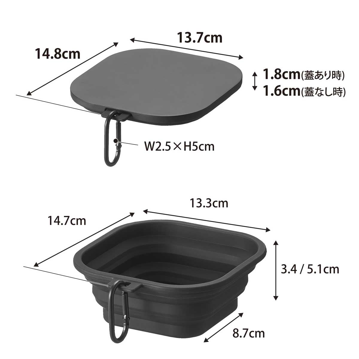 ・主な素材:シリコーンゴム、ナイロン(本体)/ポリプロピレン(蓋)/アルミニウム合金(フック付きリング)
