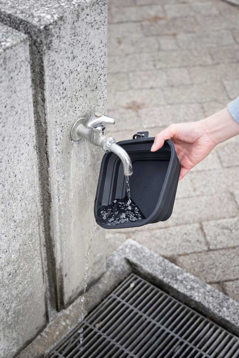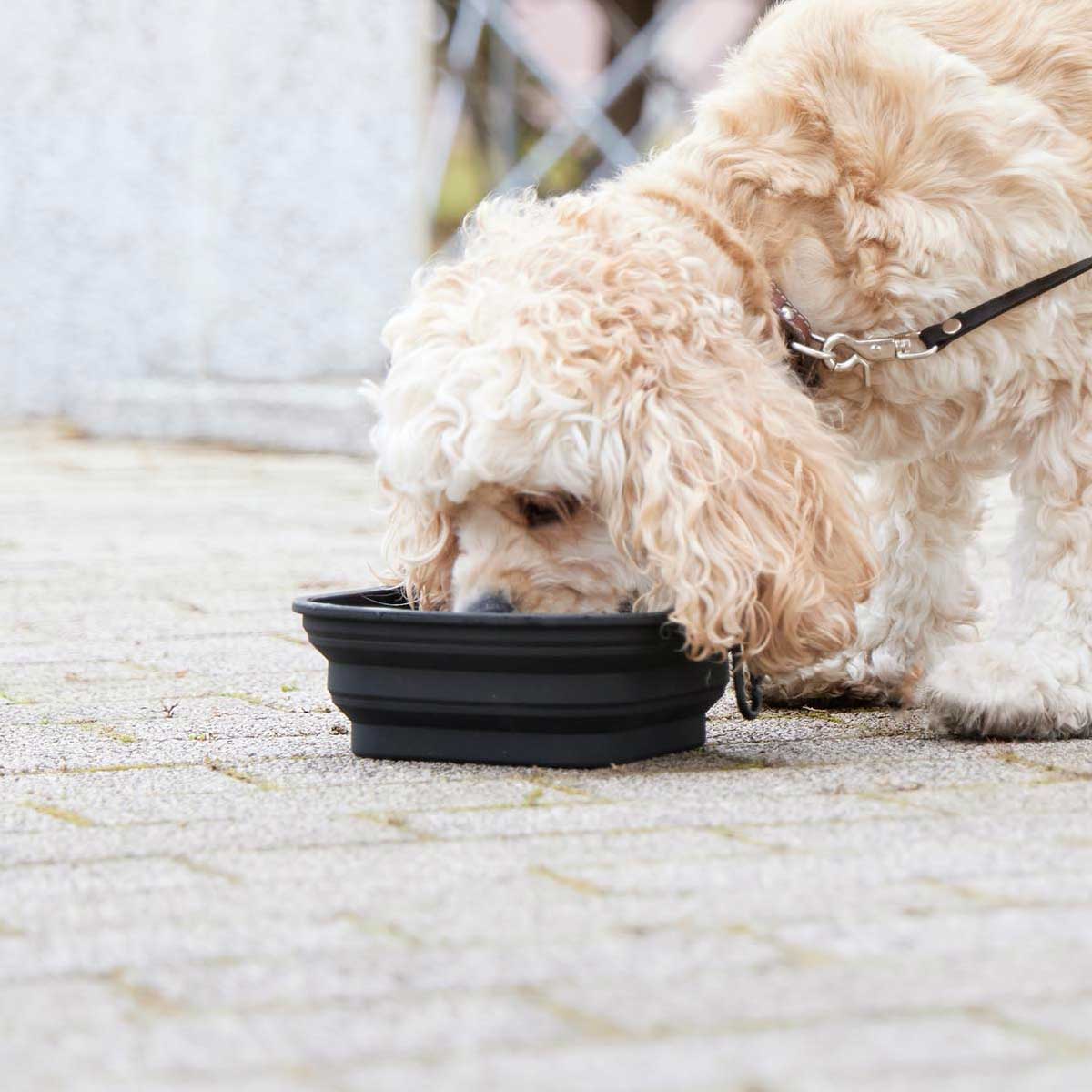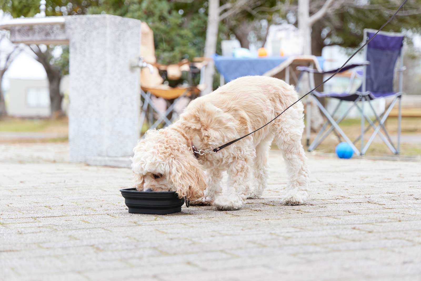 蓋付きで持ち運びに便利な折り畳み式のペットフードボウルです。容量は1Lと大きめで中型〜大型犬にぴったりのサイズ。夢中で食べてもズレにくいシリコーン製です。使用後はサッと水洗いでき、ボウル内部が濡れたままでもフタをして、そのままバッグに入れて持ち運べます。吊り下げに便利なフック付きリングも付属しています。