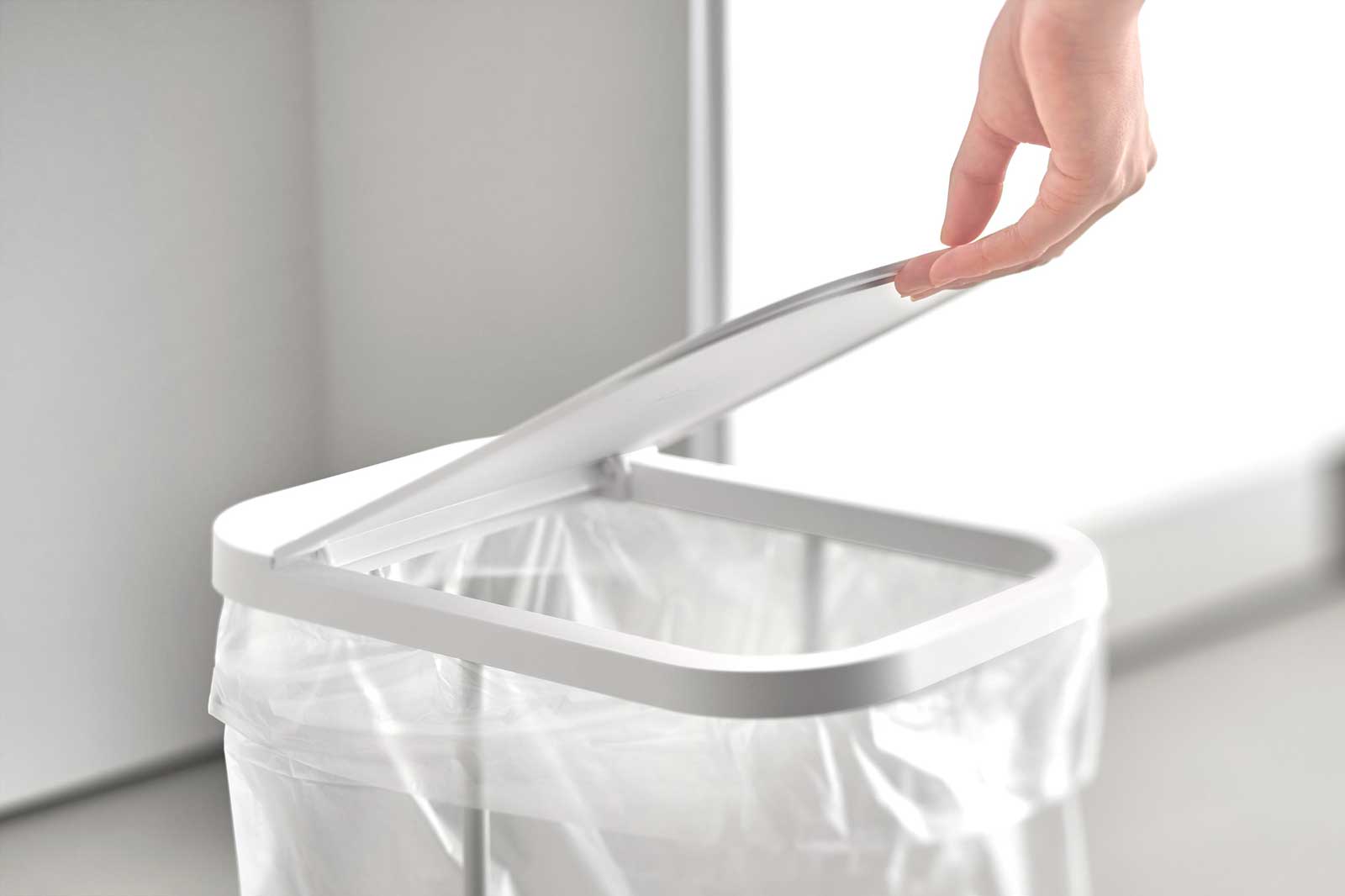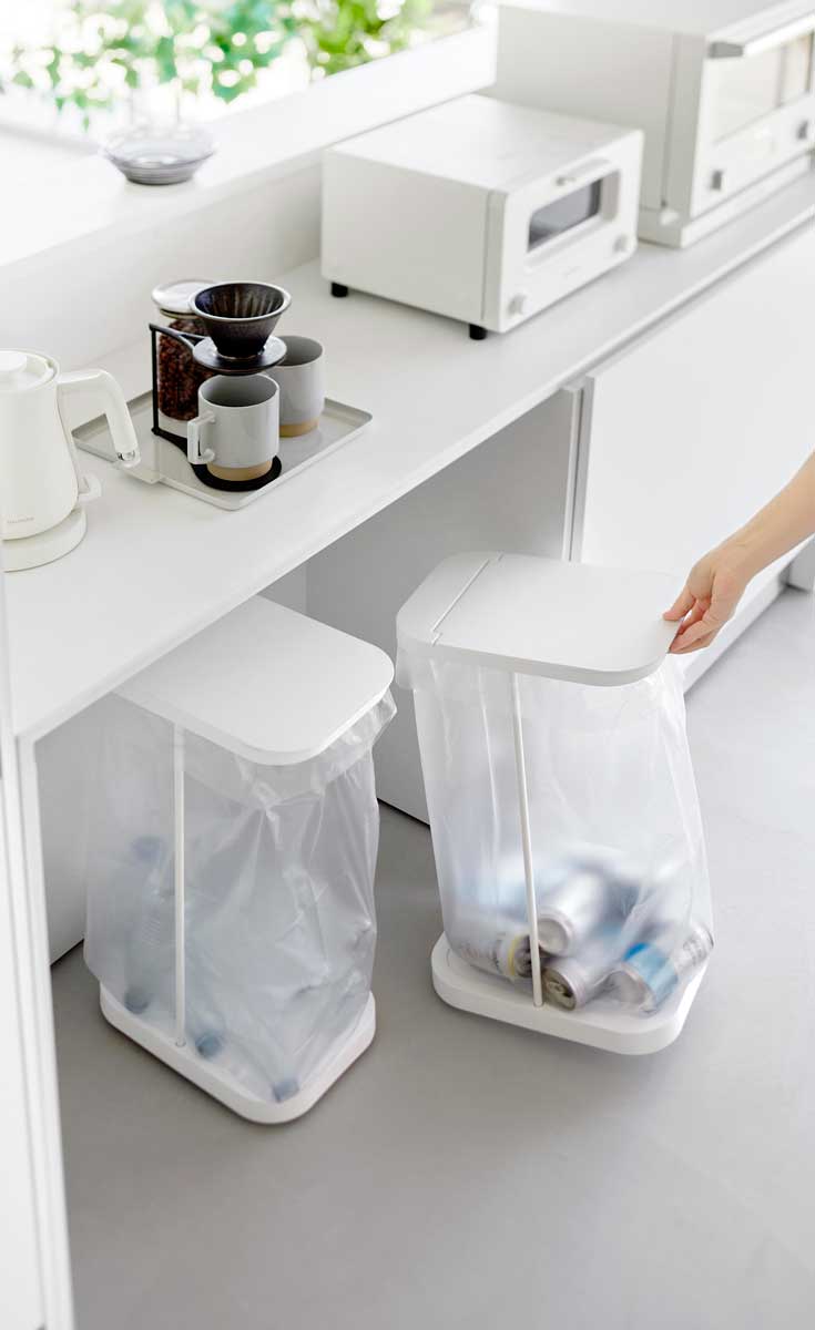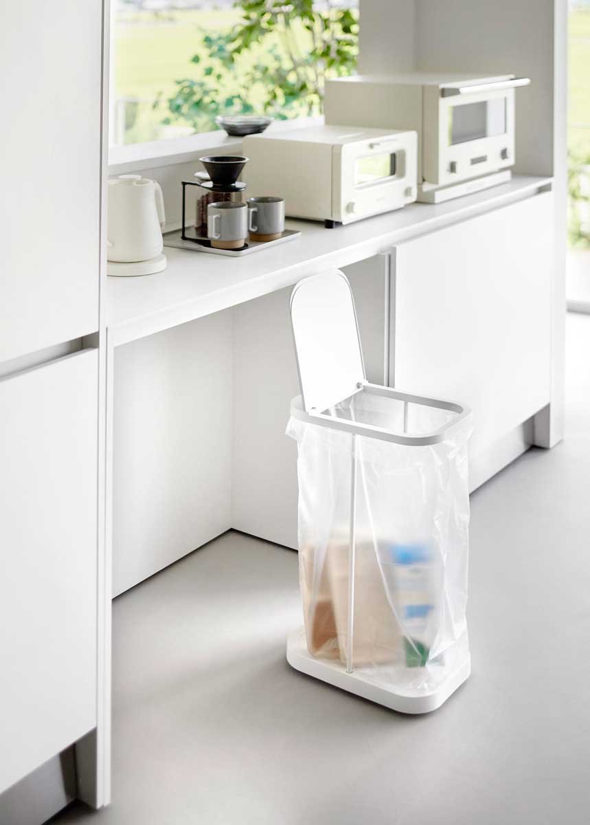 棚下にスッキリ収まるキャスター付きゴミ袋ホルダー。スチールフレーム・蓋・台座で構成された、シンプルなゴミ袋ホルダーです。中身が見えにくく臭いも軽減できる蓋付き。外枠の制限がないので、ゴミ袋の容量いっぱいにゴミを入れられます。