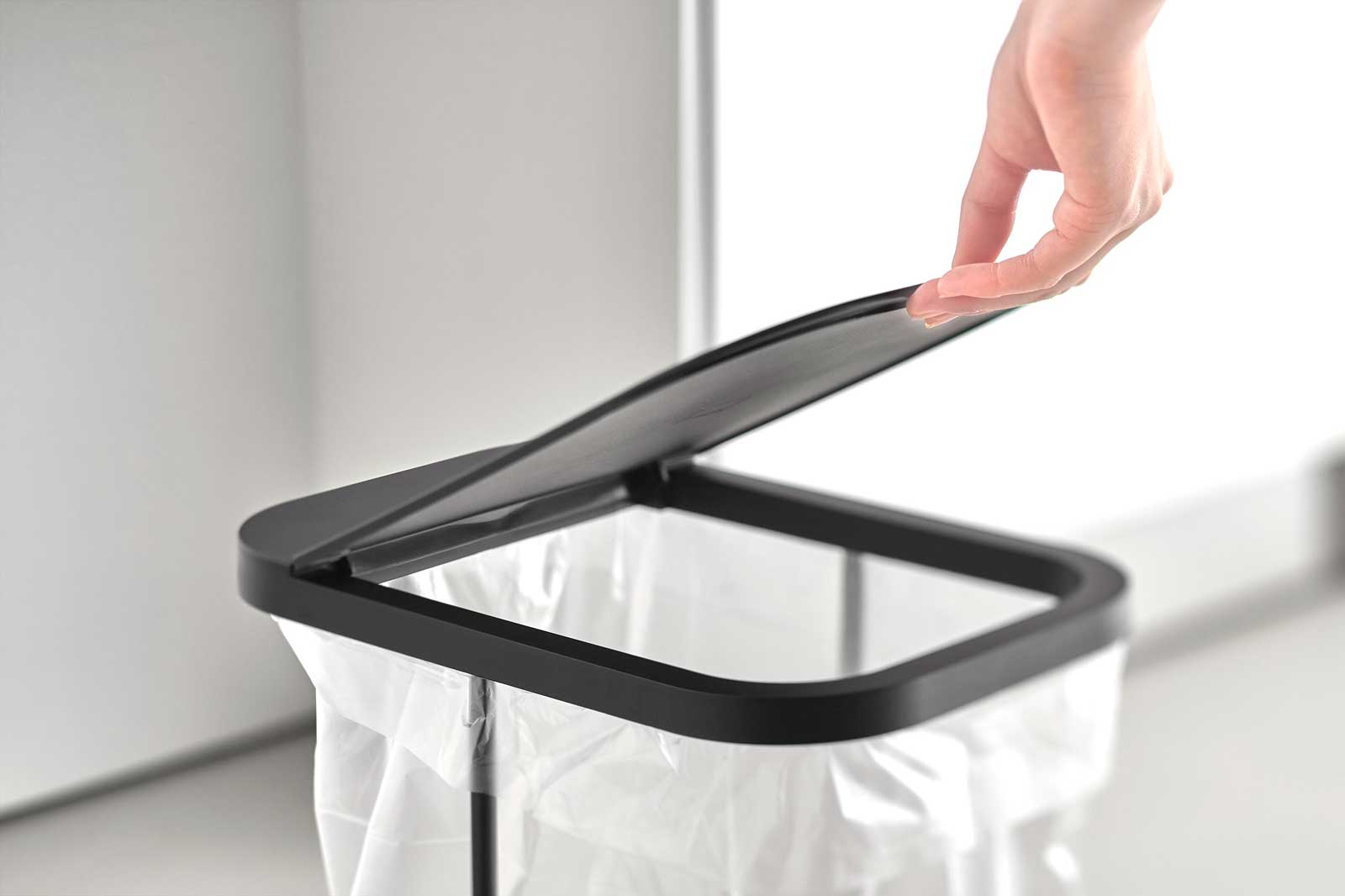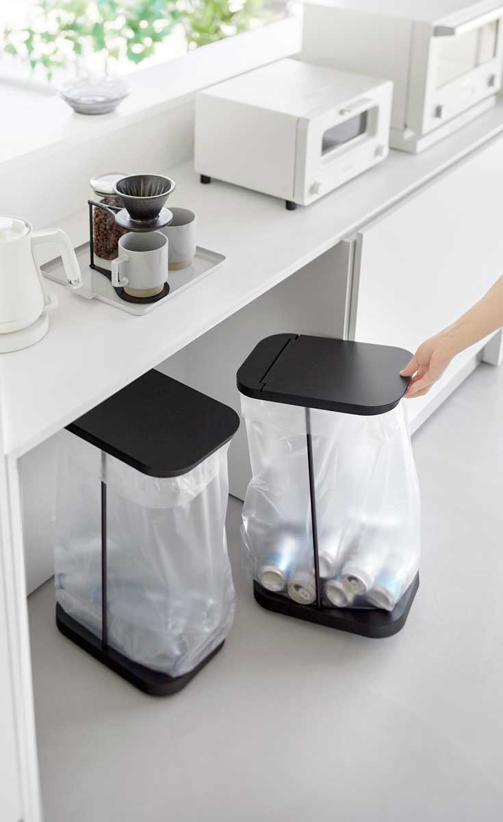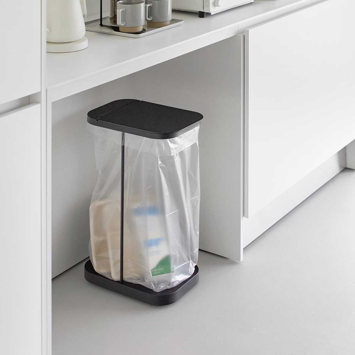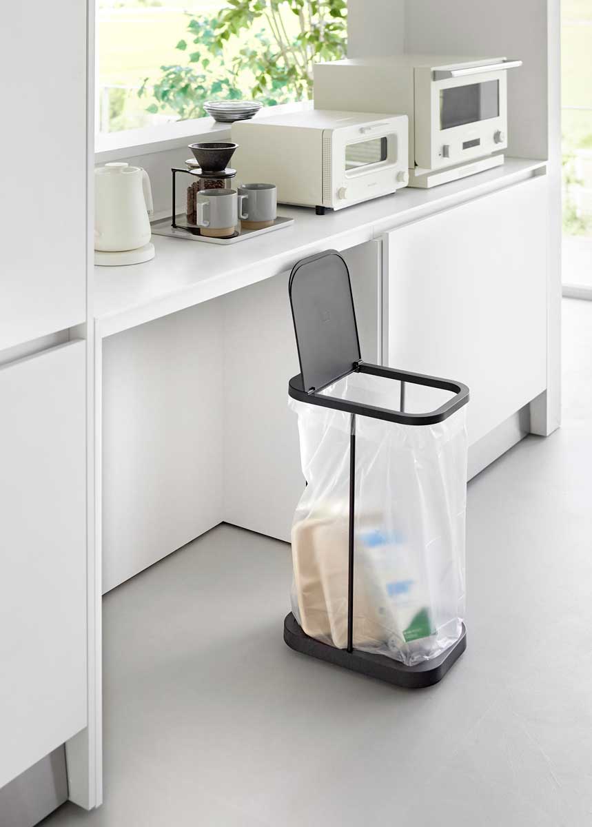 棚下にスッキリ収まるキャスター付きゴミ袋ホルダー。スチールフレーム・蓋・台座で構成された、シンプルなゴミ袋ホルダーです。中身が見えにくく臭いも軽減できる蓋付き。外枠の制限がないので、ゴミ袋の容量いっぱいにゴミを入れられます。