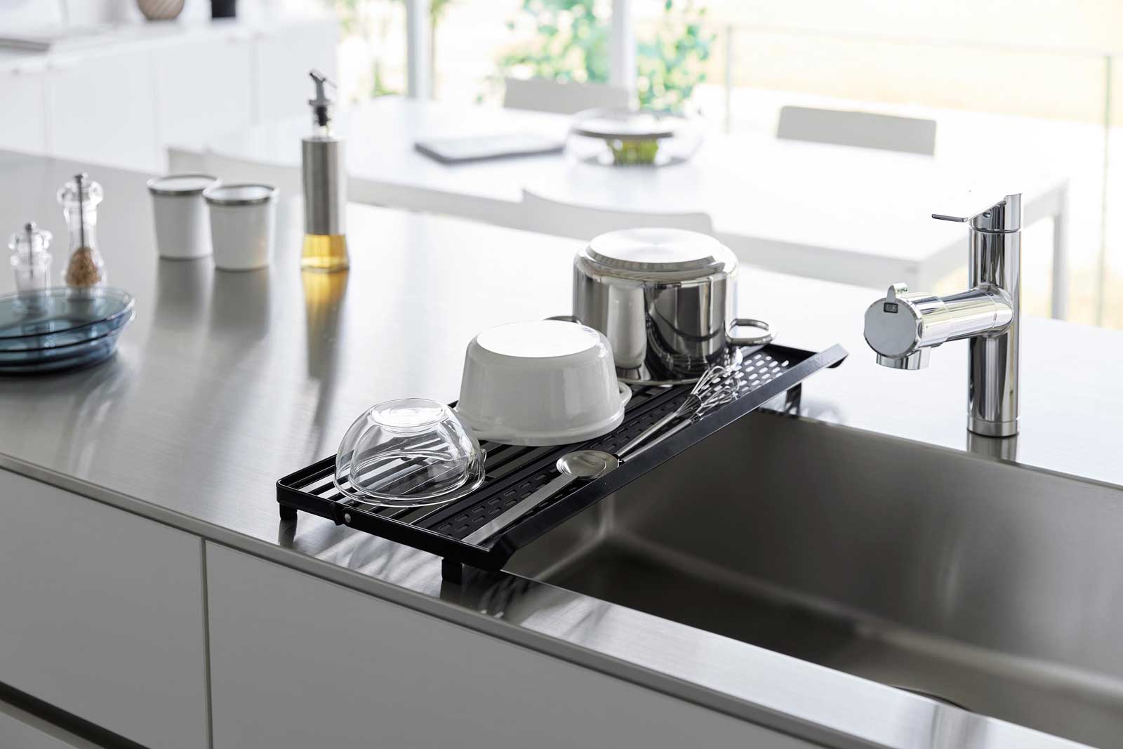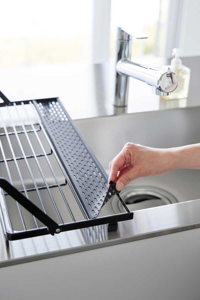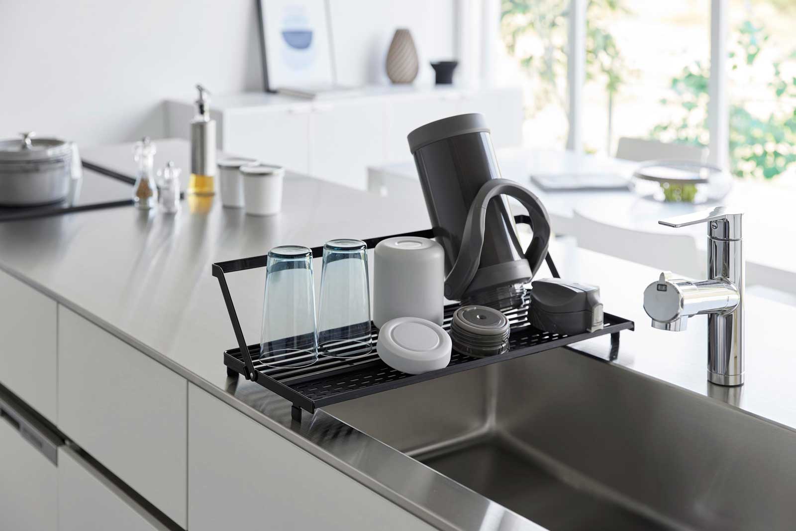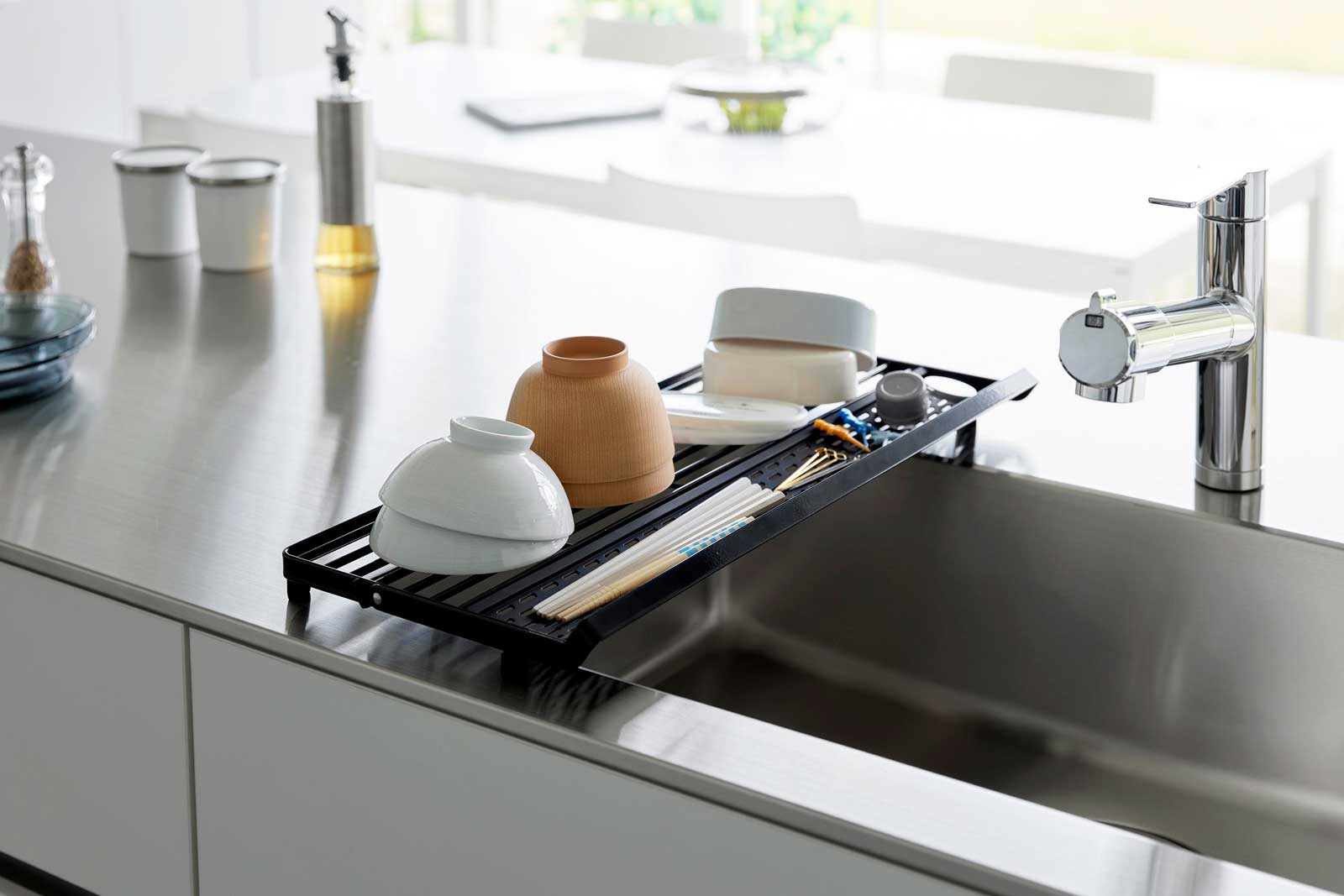 シンクに渡して使えるスリム設計で場所を取らないシリコーントレー付きの水切りラックです。可動式のバーを立てることで、ジャグボトルやまな板、お皿などを立てて乾かせます。シリコーン製のトレーには、お箸や小物の水切りに最適で、取り外し可能なのでお手入れも簡単です。