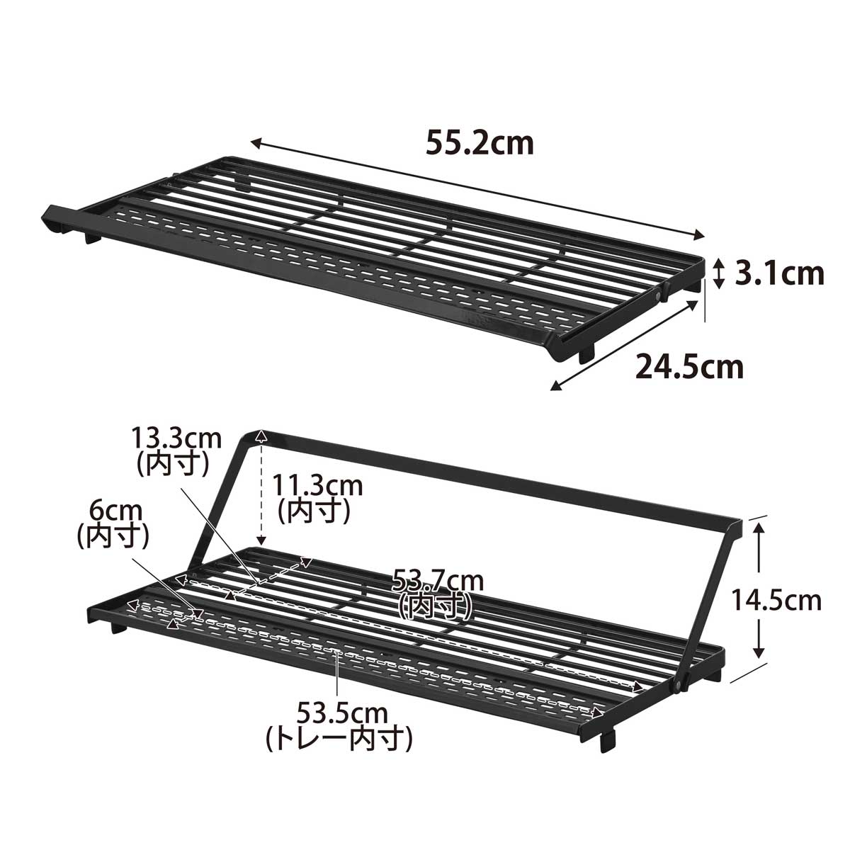 ・内寸サイズ:約W537xD133mm(ラック)/約H113mm(バー使用時)/約W535xD60mm(シリコーントレー)