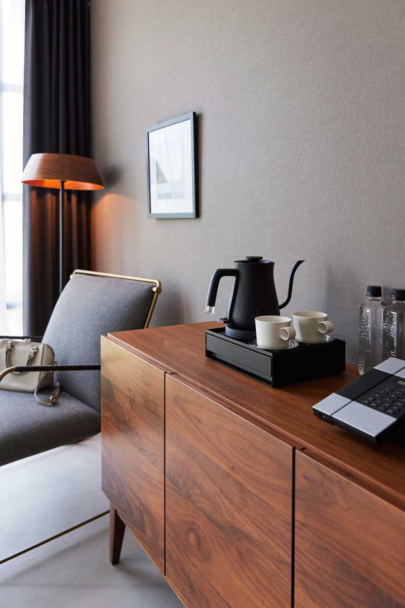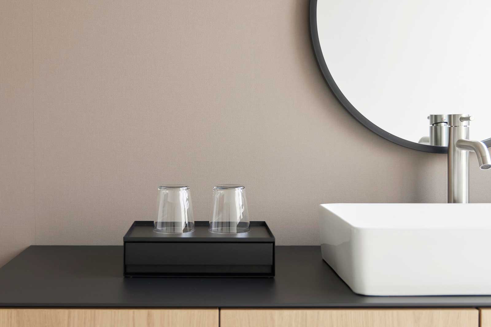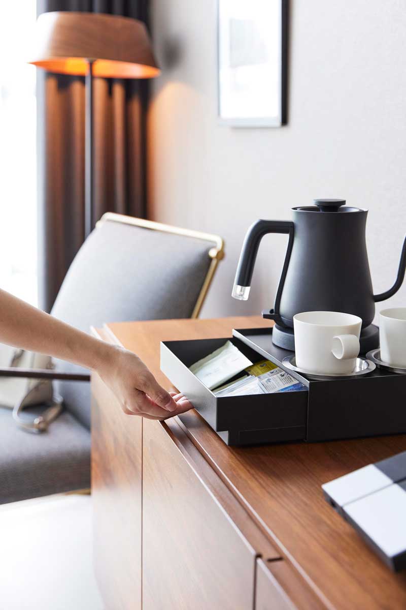 本体天板はフチ付きで、トレーのように安心して小物を置ける仕様です。引き出し内は、付属の可動式マグネット仕切りで整理しやすく、取り出しもスムーズです。宿泊施設や店舗をはじめ、ご自宅やオフィスでもホテルライクな空間を演出できます。