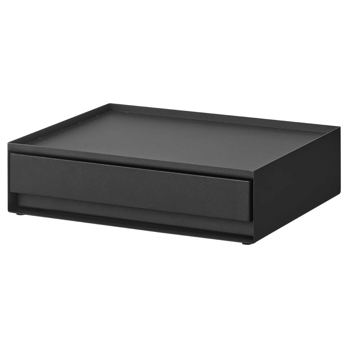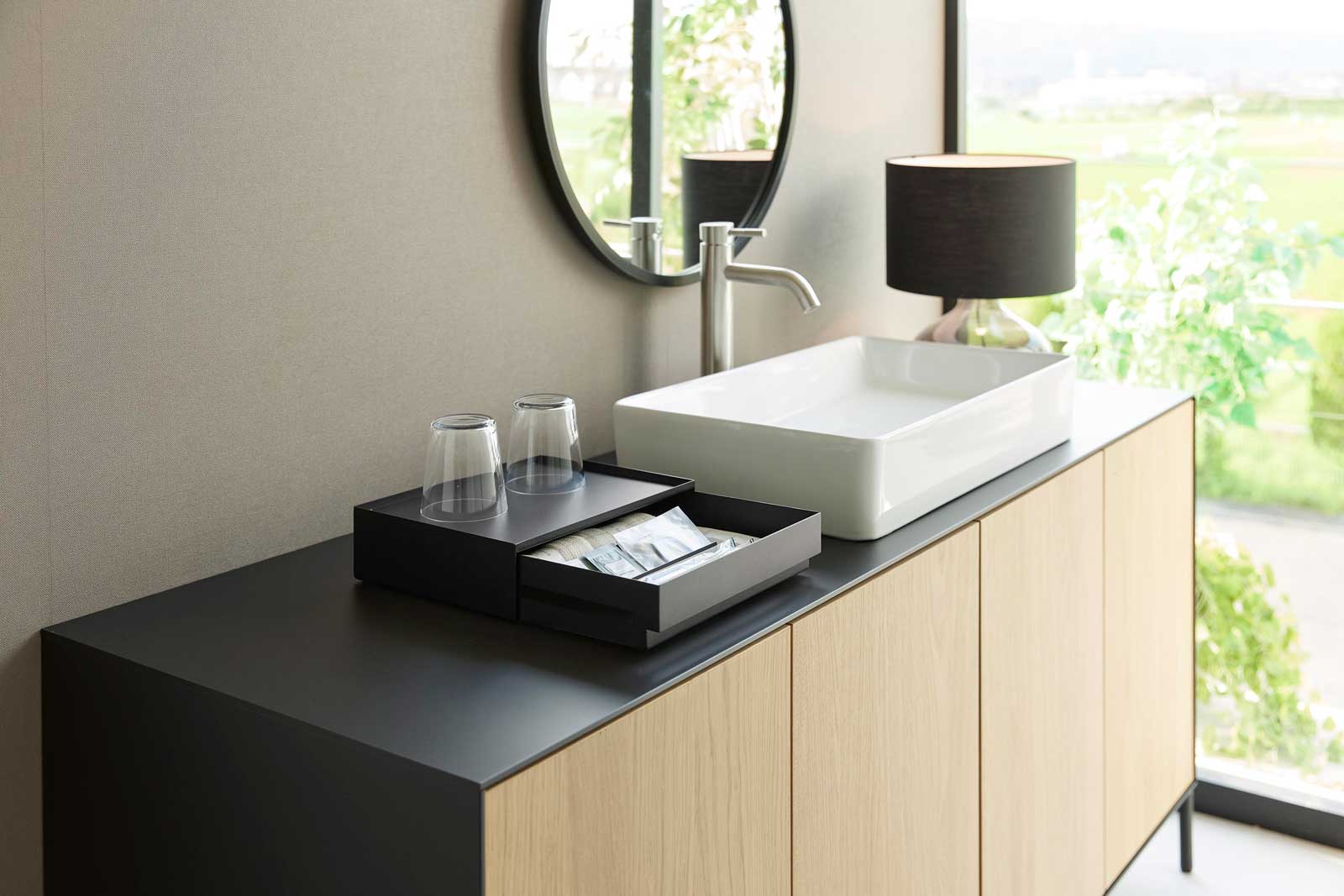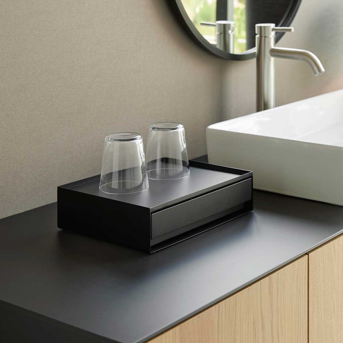 洗面アメニティなどを隠して収納できるトレー付きの引き出しケース。洗面まわりのアメニティグッズやドリンクまわりの小物をすっきり隠して収納できる、スチール製の引き出し式ケースです。