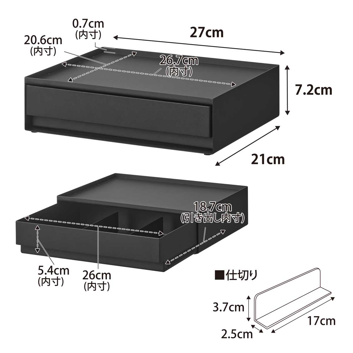 ・内寸サイズ:約W267xD206xH7mm(トレー)/約W260xD187xH54mm(引き出し)/約W170xD25xH37mm(仕切り)