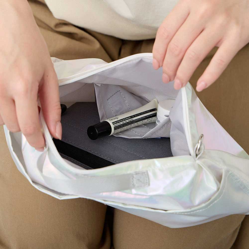 ショルダーベルトは長さ調節ができ、取り外しも可能。斜め掛けでアクティブに動きたいときは「サコッシュ」として。ベルトを外せばワンハンドルの「ミニトート」に早変わり。さらにバッグインすれば、「ポーチ」のようにも使えます。ファスナー開閉で中身が見えずに安心。細かなものが迷子になりにくい内ポケット付き。背面には2つのルーポケットを配置。さらにうれしいのは、手洗い可能なところ。