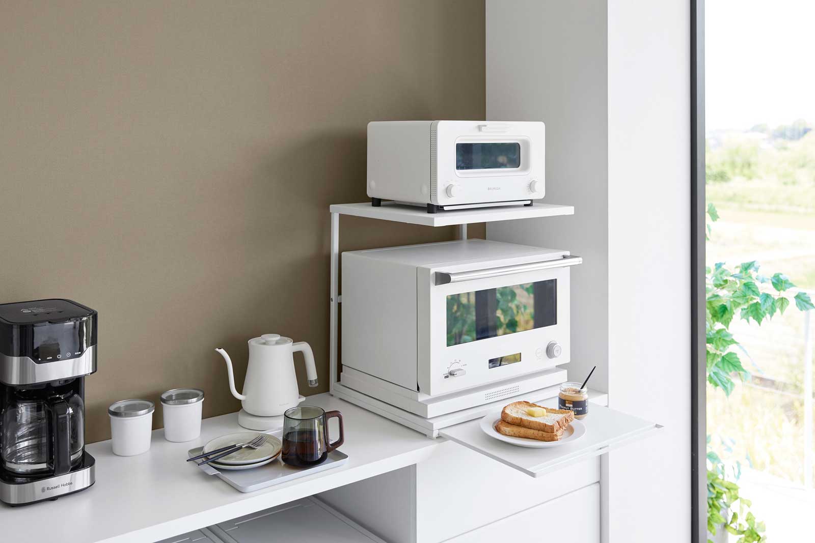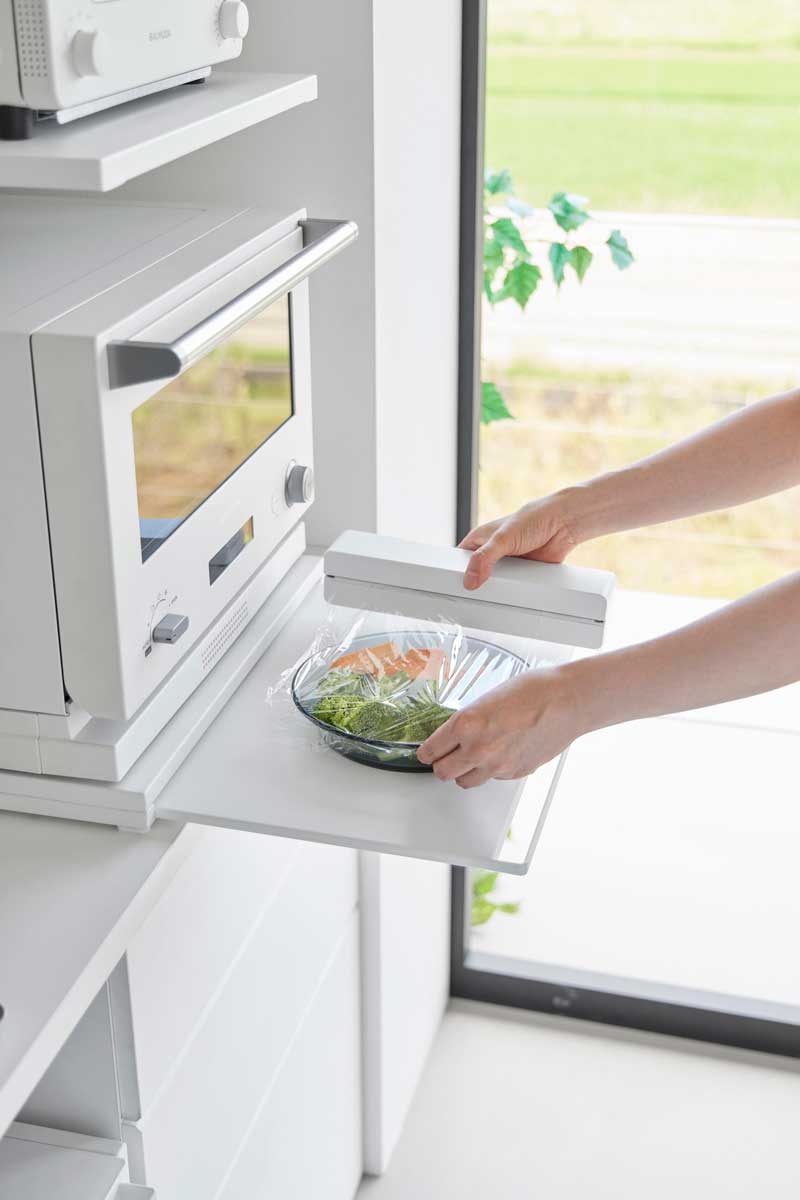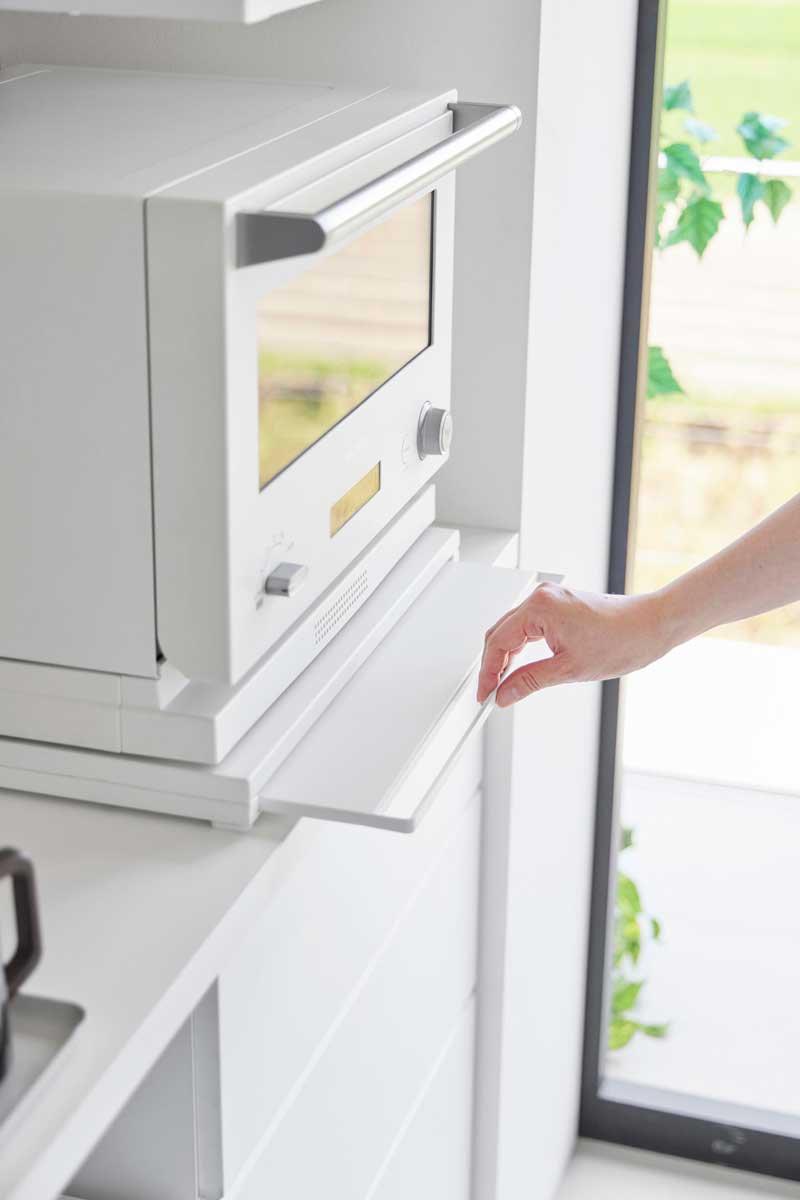 キッチン家電を、省スペースにまとめて設置できる2段式のキッチンラック。上棚にはトースター、下段の置台には電子レンジなどとキッチン家電をまとめて収納できるスチール製のキッチンラックです。一番下はスライドテーブル付きで、料理中の一時置きや作業スペースとして活躍します。