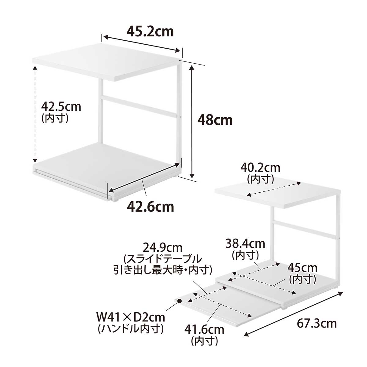 ・内寸サイズ:約W452xD402mm(上棚)/約W450xD384xH425mm(置き台)/約W416xD249mm(スライドテーブル引き出し時最大)
