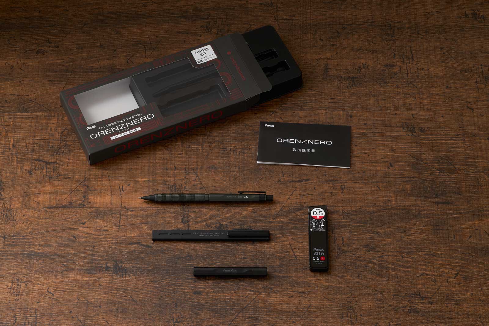 オレンズネロの「所有感」や「存在感」といった世界観を継承し、名前の由来である「黒(NERO)」にこだわった、限定カラー2色を含む限定セットを発売。1回のノックだけで書き続けることができる「自動芯出し機構」を搭載したシャープペンシル「オレンズネロ」。限定カラーのオレンズネロと特性の金属製替芯ケースとホルダー消しゴムをセットにした限定パッケージです。