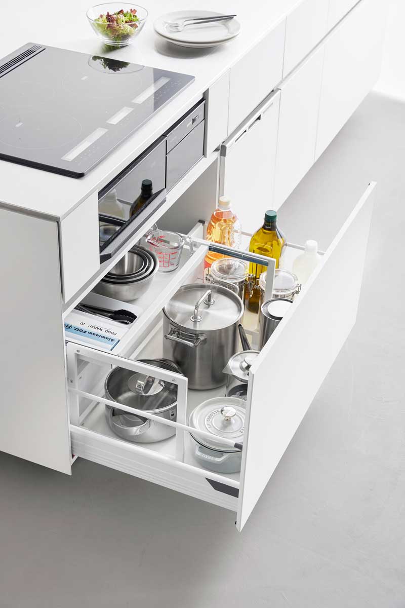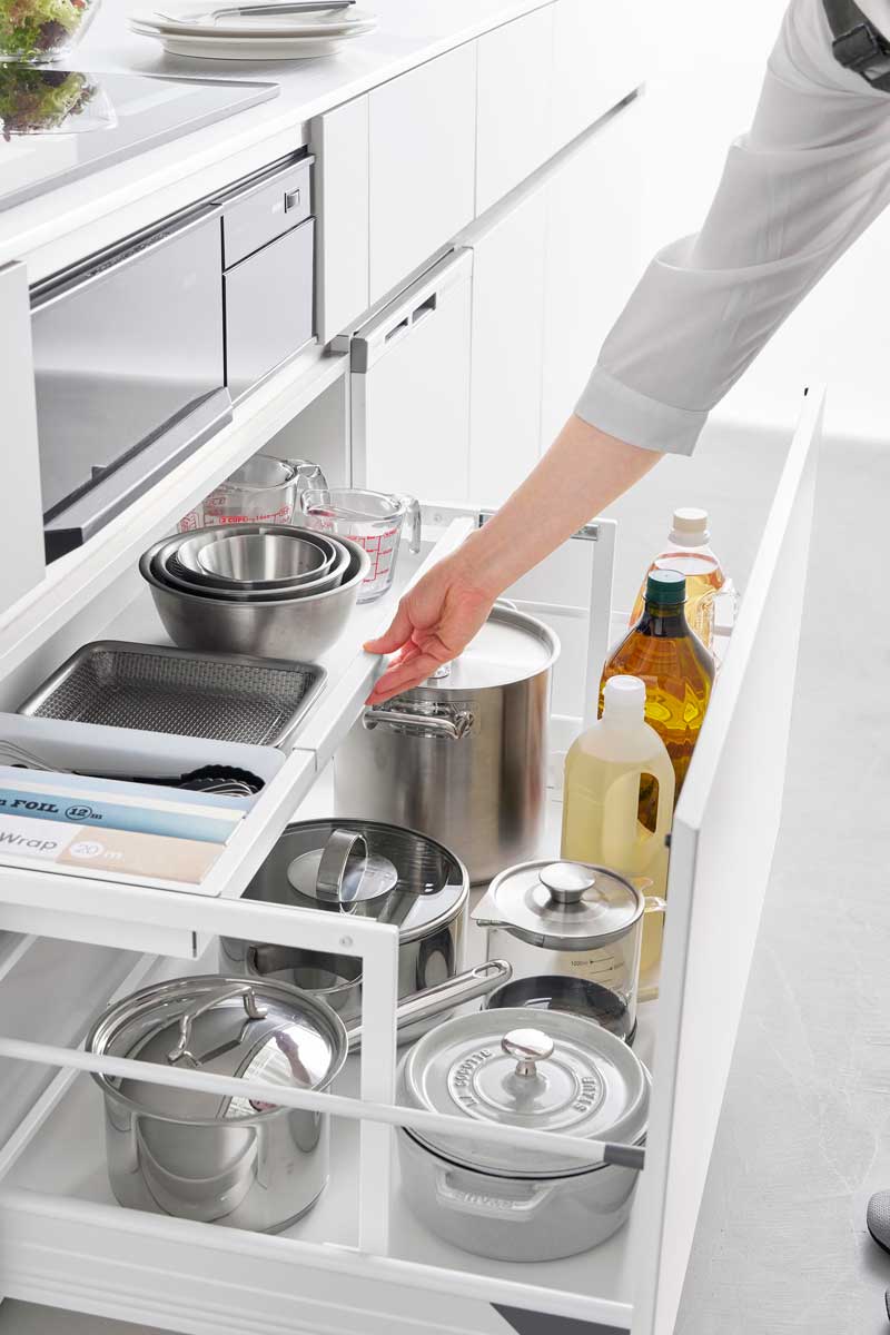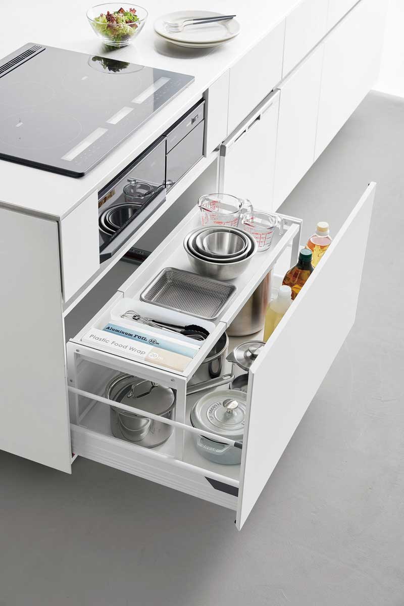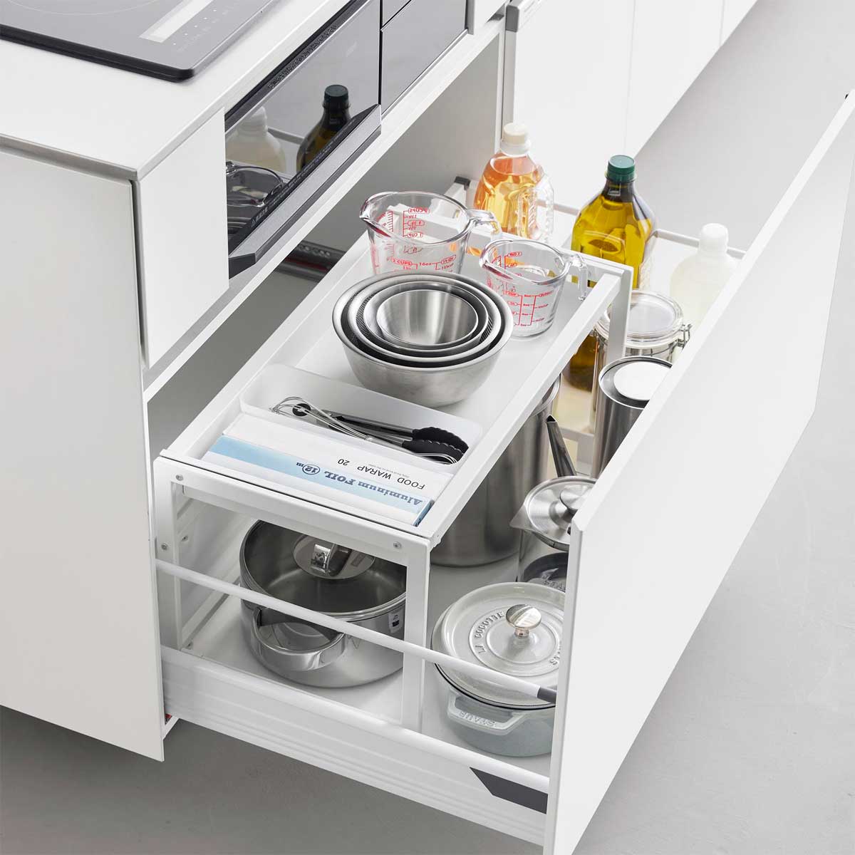 収納場所が増える奥行き30cmのラック。シンク下の引き出しに設置して、収納スペースを増やせる奥行き30cmのラックです。深さのある引き出しの、余りがちなスペースを無駄なく活用できます。