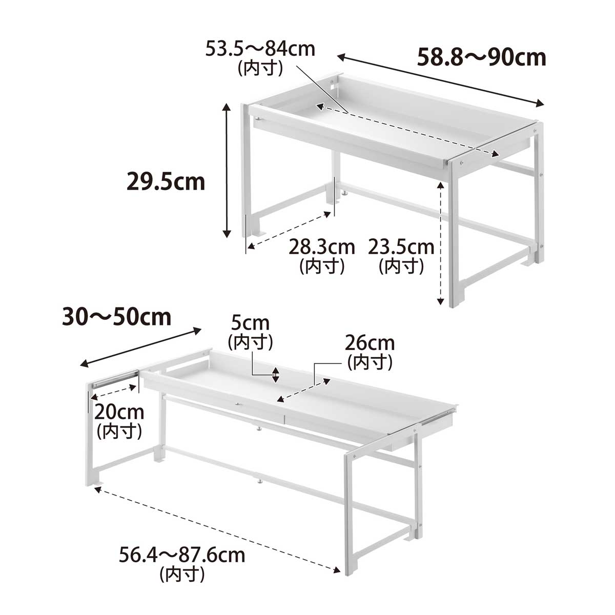 収納ラックは横幅58.8〜90cmまで伸縮可能で、設置する収納場所に合わせて調節できます。天板は奥へスライドでき、片手で簡単に動かせるため、下段に収納した物もスムーズに取り出せます。