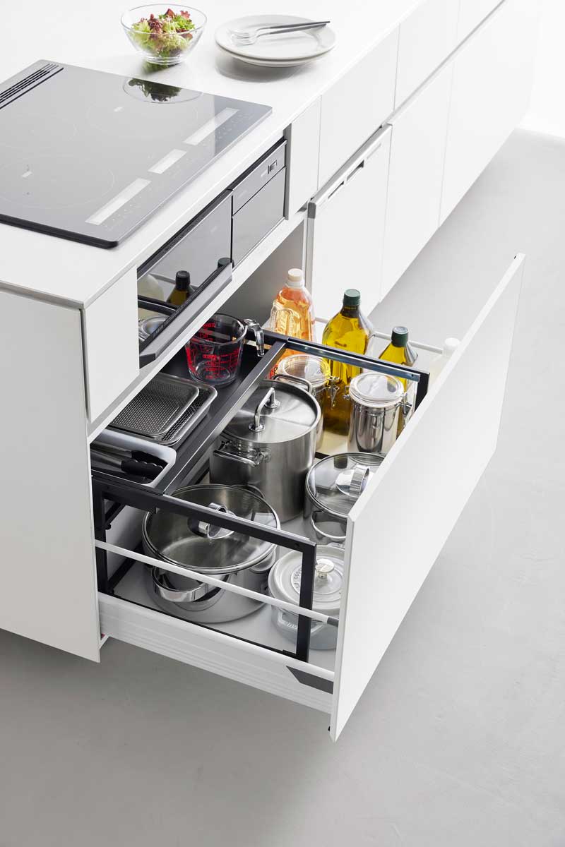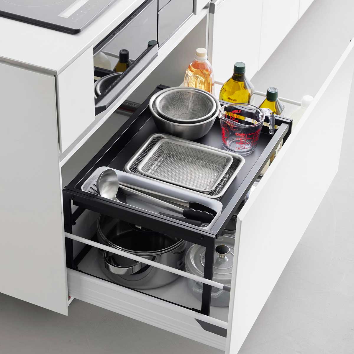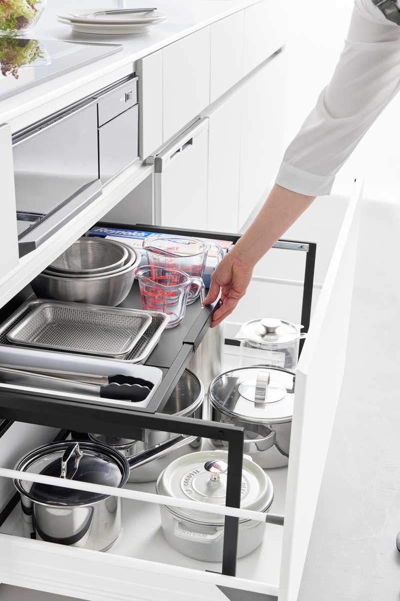 収納場所が増える奥行き40cmのラック。シンク下の引き出しに設置して、収納スペースを増やせる奥行き40cmのラックです。引き出しの奥行きを無駄なく活かせる広々とした設計で、収納スペースを確保できます。