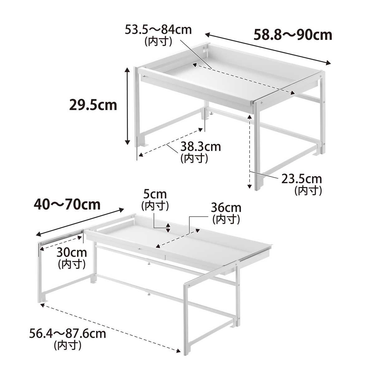 ラックは横幅58.8〜90cmまで伸縮可能で、設置する収納場所に合わせて調節できます。天板は奥へスライドでき、片手で簡単に動かせるため、下段に収納した物もスムーズに取り出せます。
