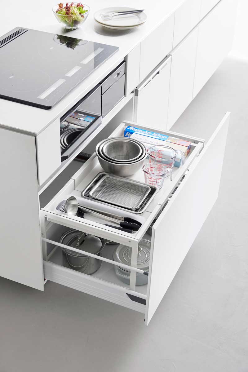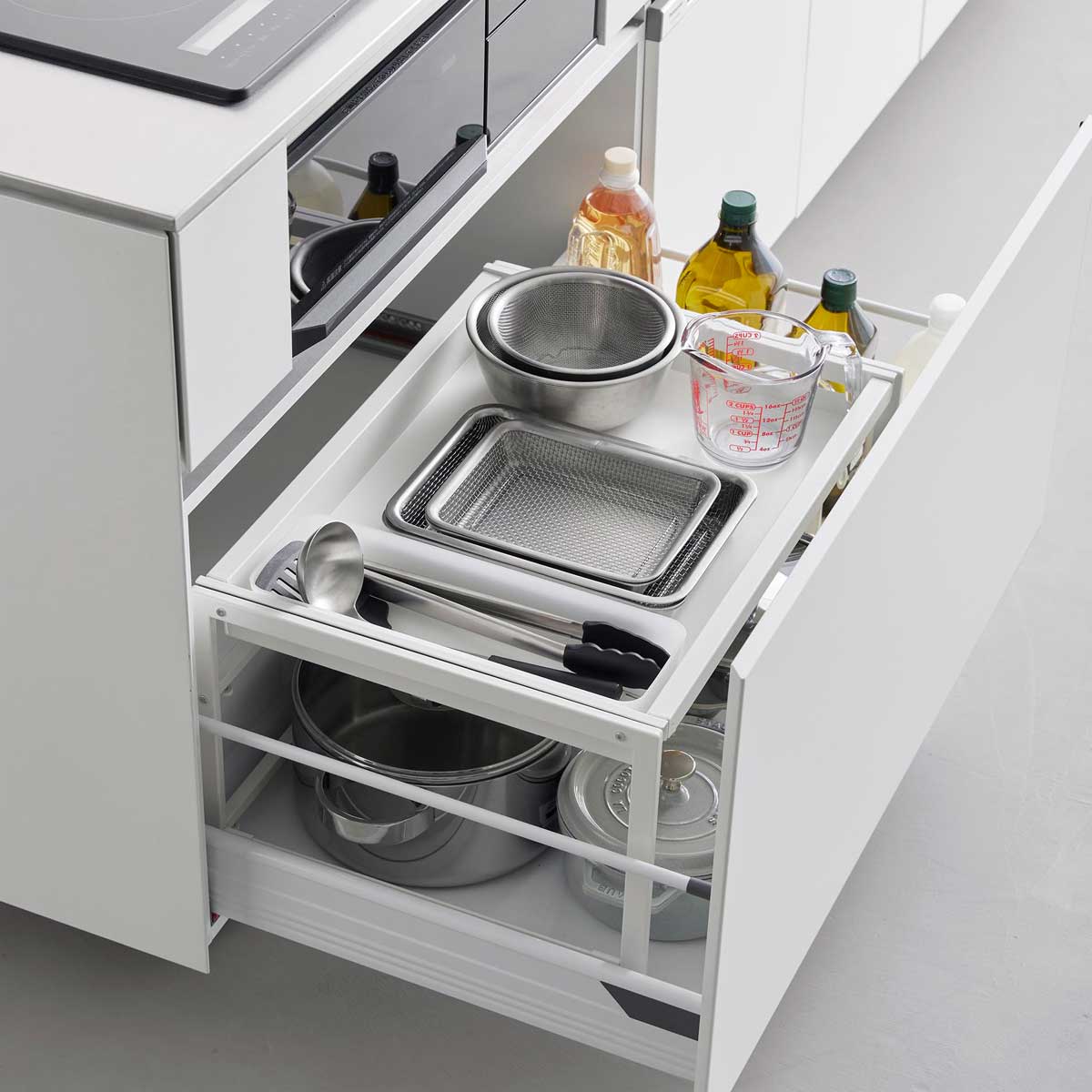 収納場所が増える奥行き40cmのラック。シンク下の引き出しに設置して、収納スペースを増やせる奥行き40cmのラックです。引き出しの奥行きを無駄なく活かせる広々とした設計で、収納スペースを確保できます。