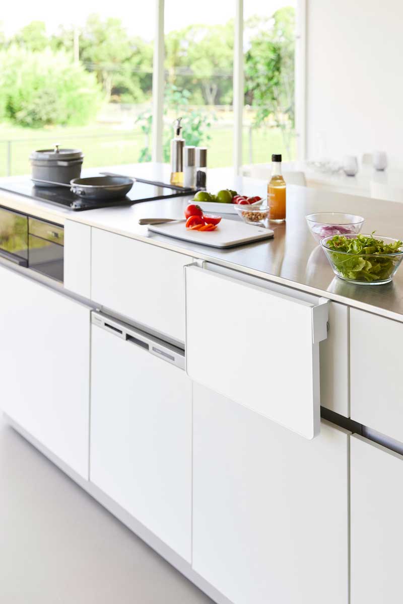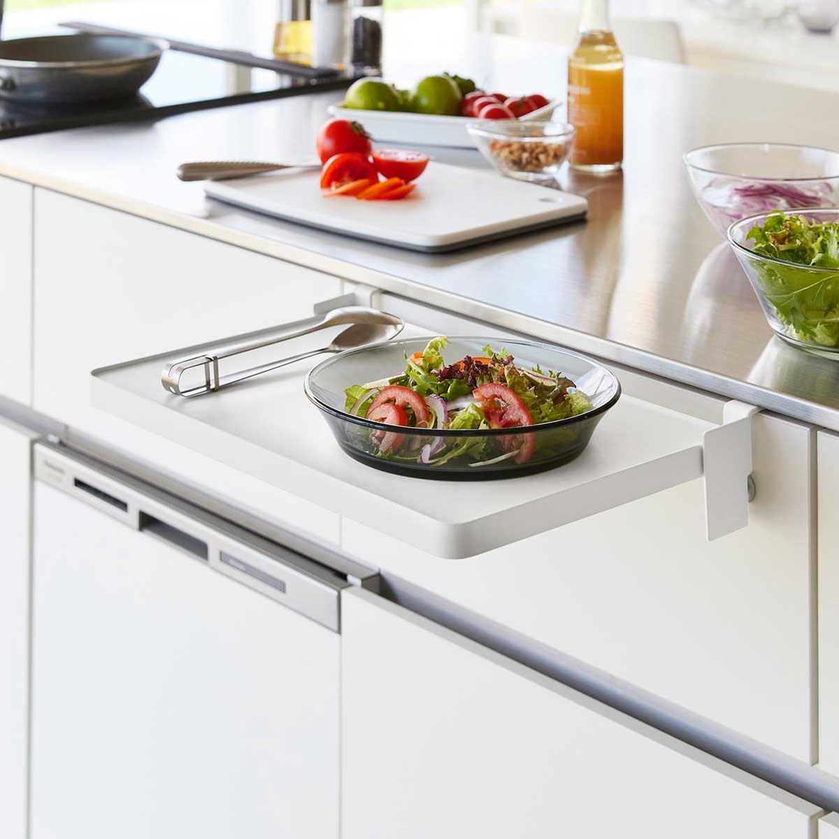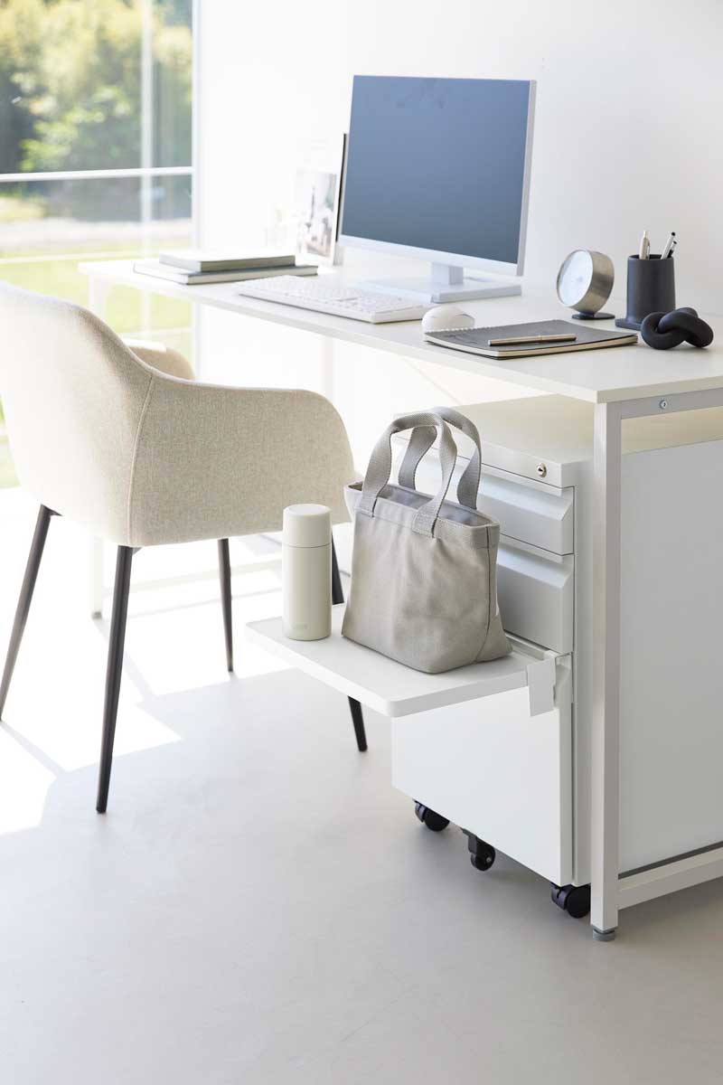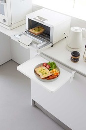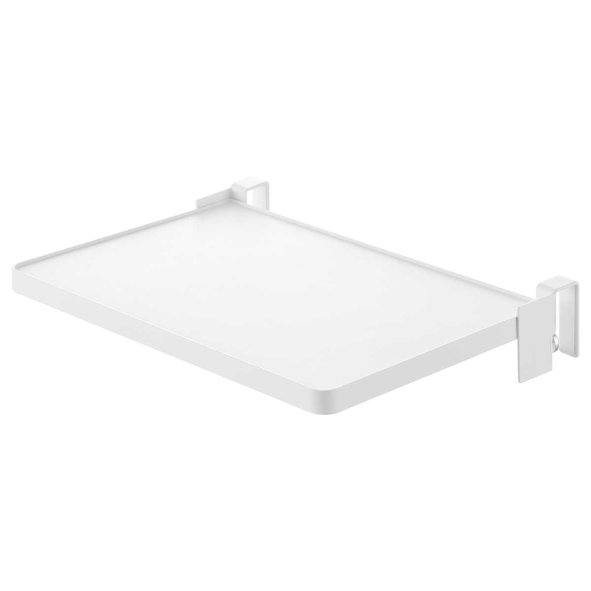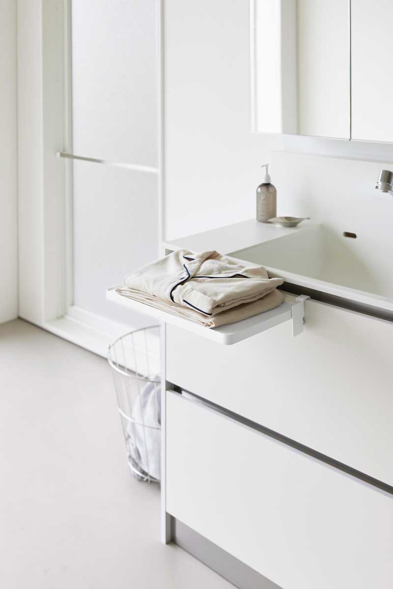 引き出しや扉に簡単設置してサッと広げられるので、キッチンでは配膳準備や調理小物の仮置きに便利です。洗面台ではメイク中のコスメ、入浴時のタオルやパジャマ置き場として使え、デスク横では作業中の資料やお弁当の置き場としても活躍します。