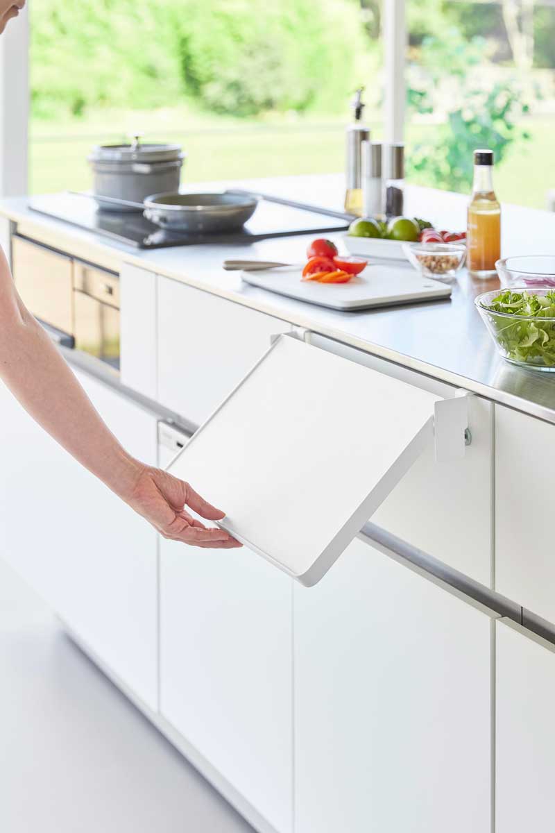 必要なときにサッと広げて使える「引っ掛け式の折り畳み棚」。引き出しや扉に取り付けられ、必要なときに手軽に棚スペースを作れるスチール製の補助棚です。棚は引き上げて押し込むだけで簡単にロックでき、使わないときは折り畳んでスリムに収納。