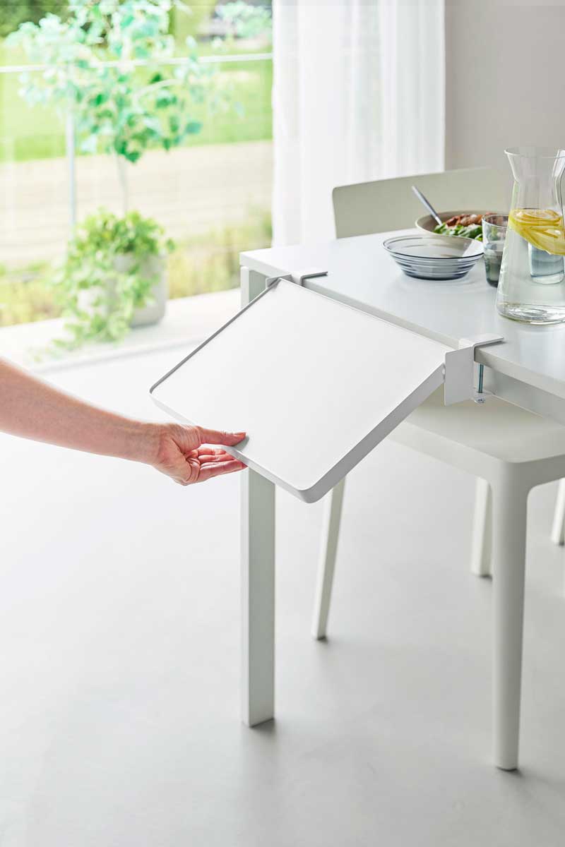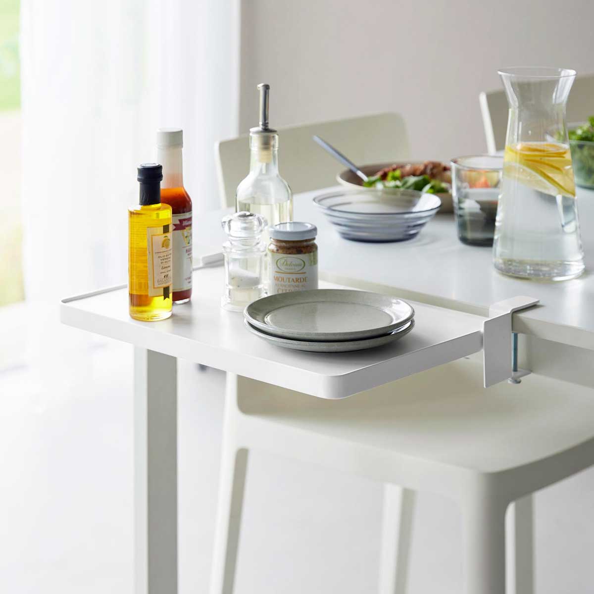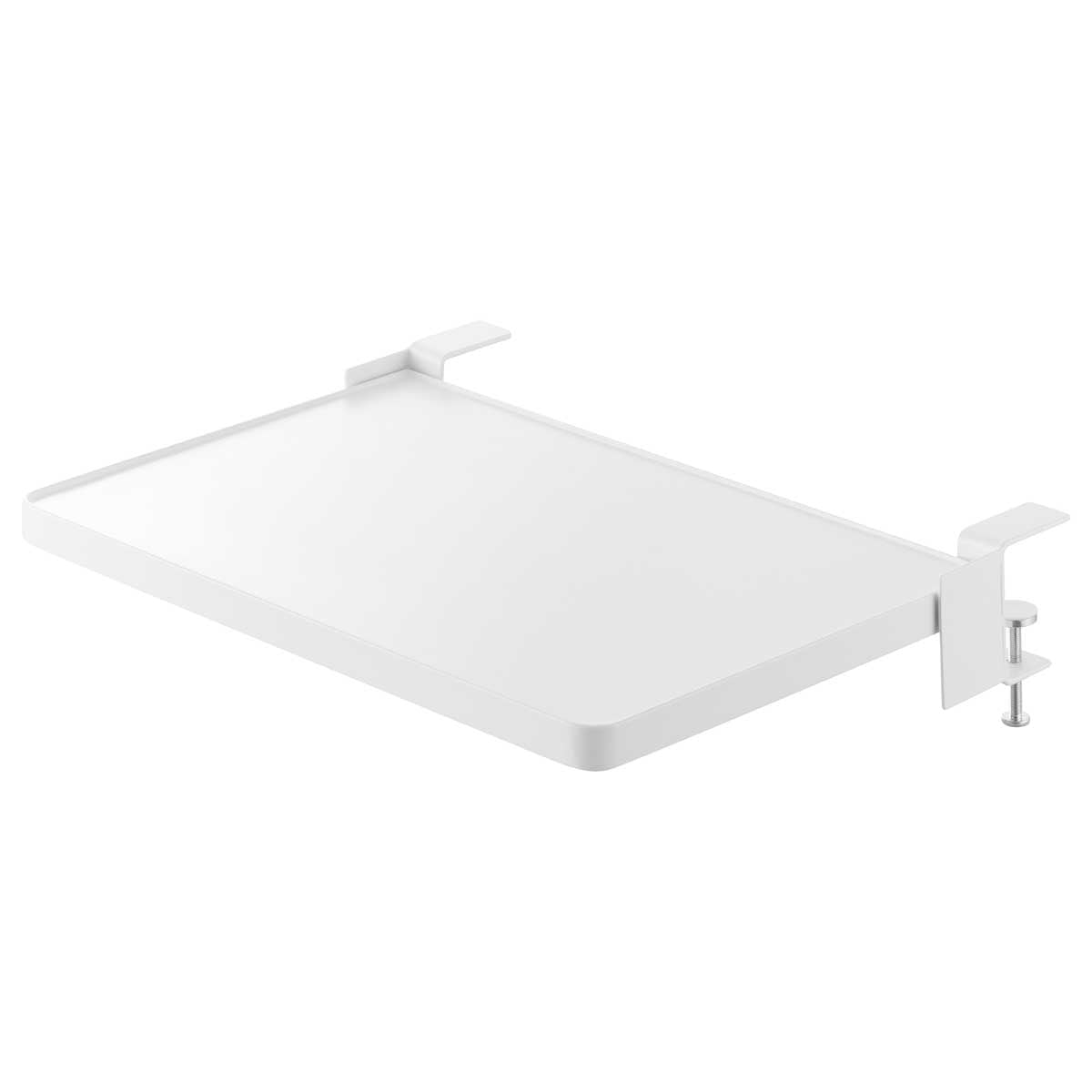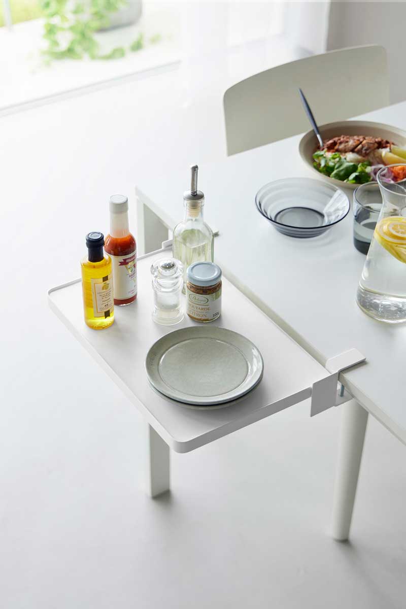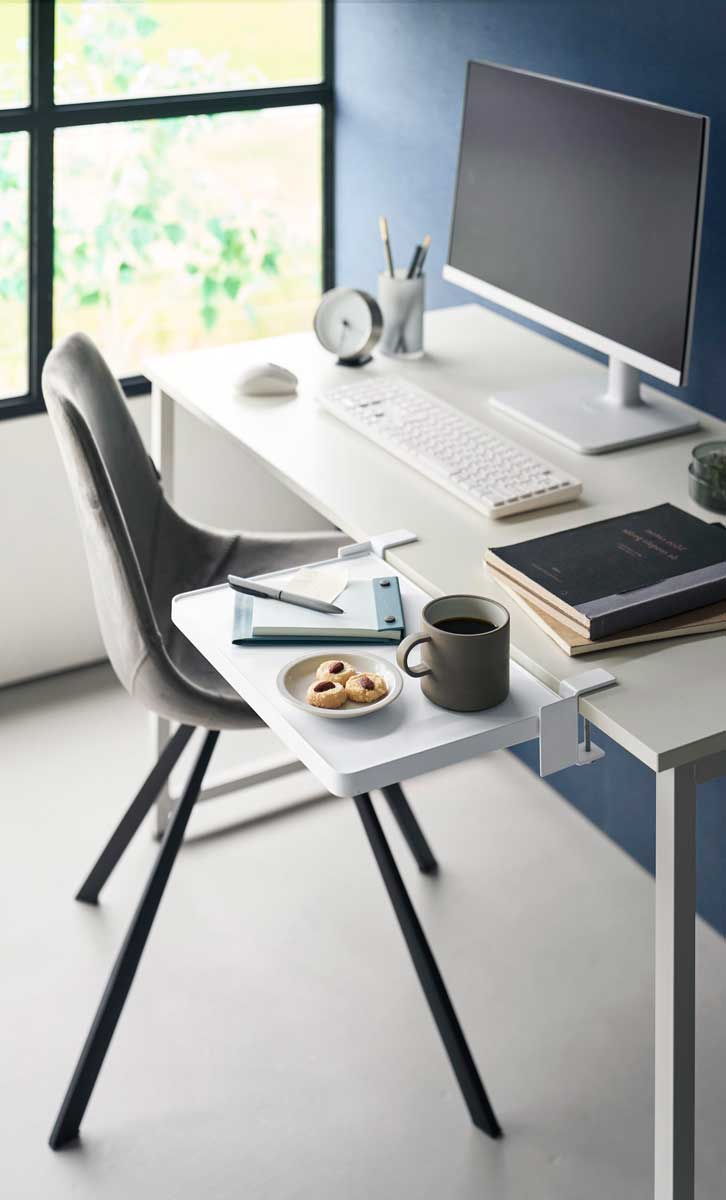 クランプ式でしっかり固定できるため、安定して使えます。ダイニングテーブルでは配膳準備や調味料の仮置きに便利。パソコンデスクでは作業スペースを広々と確保でき、作業中の資料や飲み物・おやつの一時置きとしても活躍します。