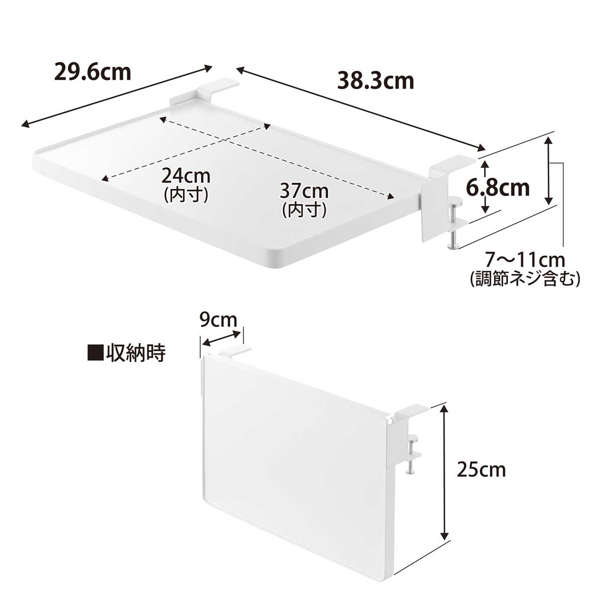 ・サイズ:約W383xD296xH68mm(使用時 ※調節ネジ含まず)/約W383xD90xH250mm(収納時)