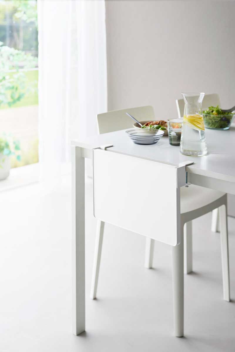 必要なときにサッと広げて使える「クランプ式の折り畳み棚」。テーブル横に取り付けられ、必要なときに手軽に棚スペースを作れるスチール製の補助棚です。棚は引き上げて押し込むだけで簡単にロックでき、使わないときは折り畳んでスリムに収納。