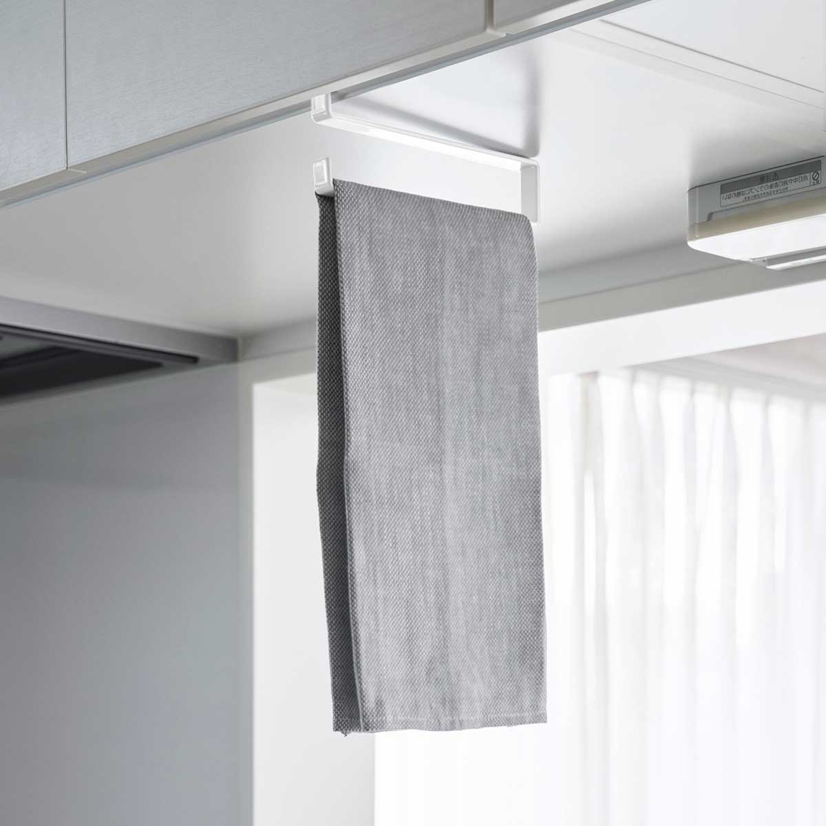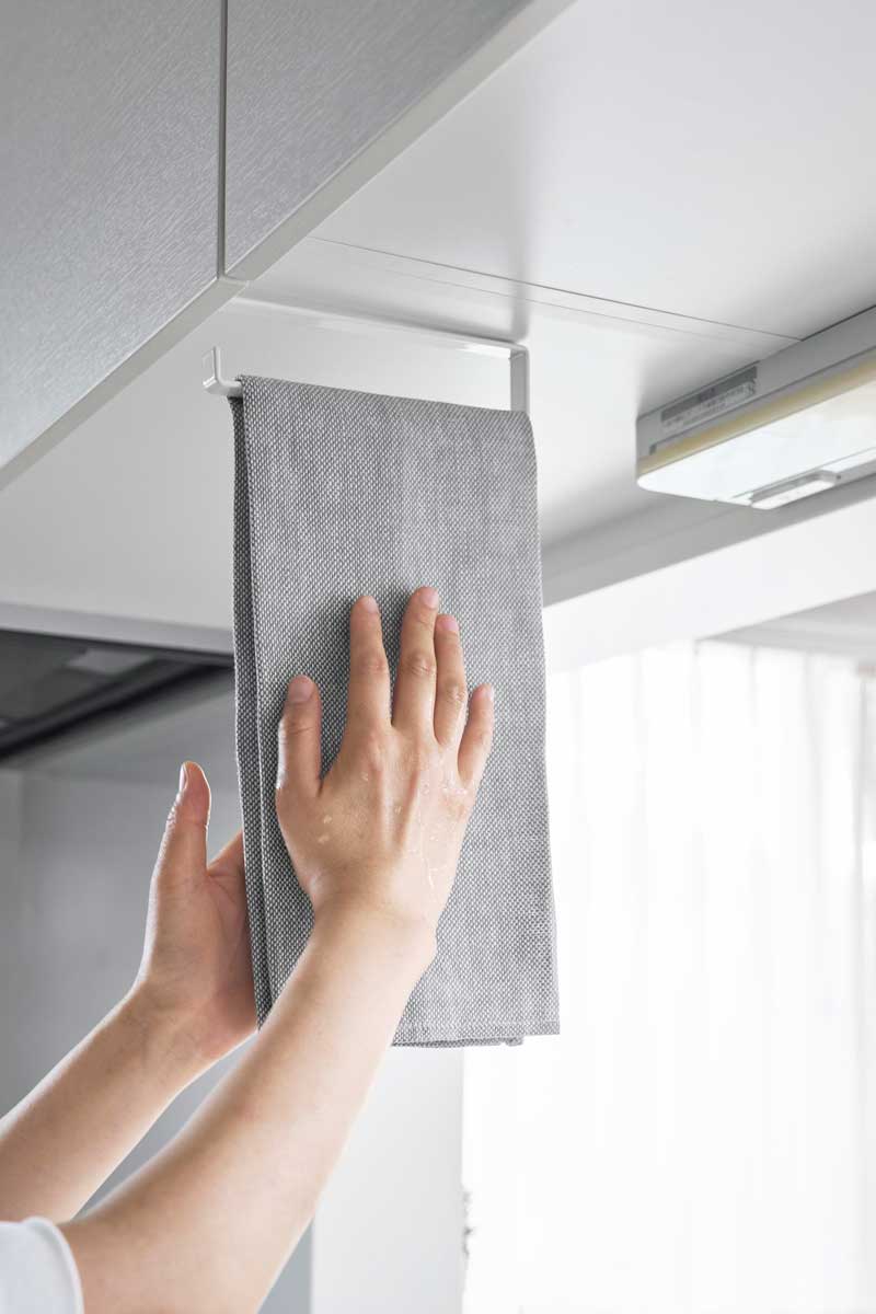 戸棚下のスペースを有効活用できるタオルハンガー。キッチンの吊り戸棚の棚板に差し込むだけで簡単に設置できるタオルハンガーです。あいたスペースにタオルを浮かせて設置でき、サッと手を伸ばすだけで手を拭いたり、タオルや布巾を掛けられます。