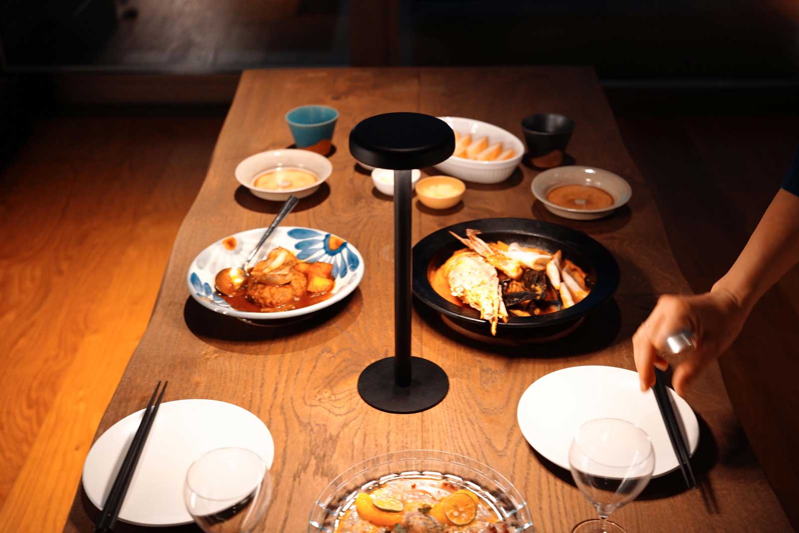 料理を美味しく肌を美しく照らす電球色のLEDを搭載。上部のユニットには、高演色(CRI 95)の暖色LEDを採用。厚みのある乳白板の奥に6灯の小さなLEDを搭載することで、電球のように優しく暖かい光を実現しました。料理はより一層美味しく、肌も綺麗に照らし出します。円柱パイプの内部に単三乾電池4本を挿入する、一切の無駄がないミニマルな設計を採用。もちろんeneloopなどの充電池にも対応。