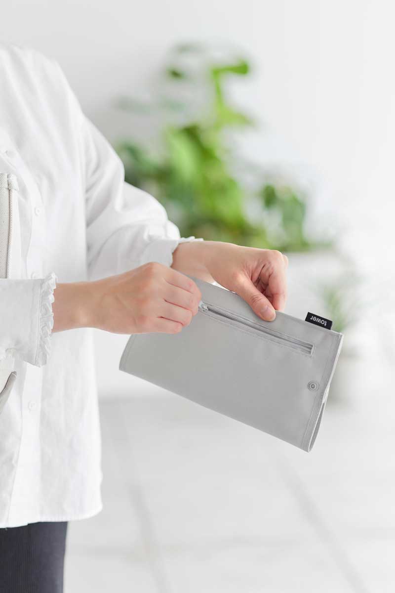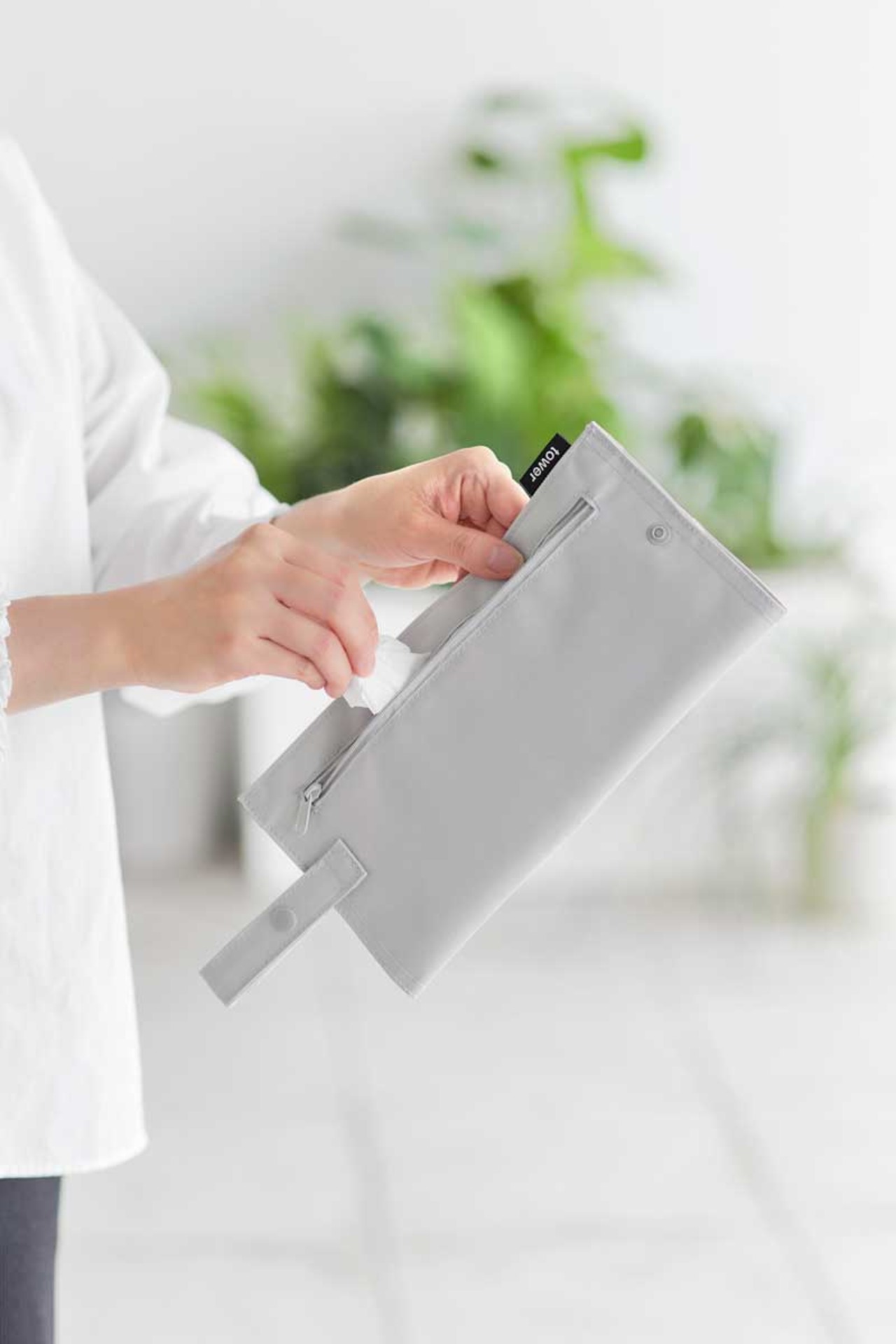 持ち運び便利くず入れ付きティッシュケース。裏面にはくず入れ用のポケットが付いており、使用後のティッシュを一時的にまとめて入れておけます。コンパクトに折りたためる仕様のため、バッグ内もすっきり整えられます。