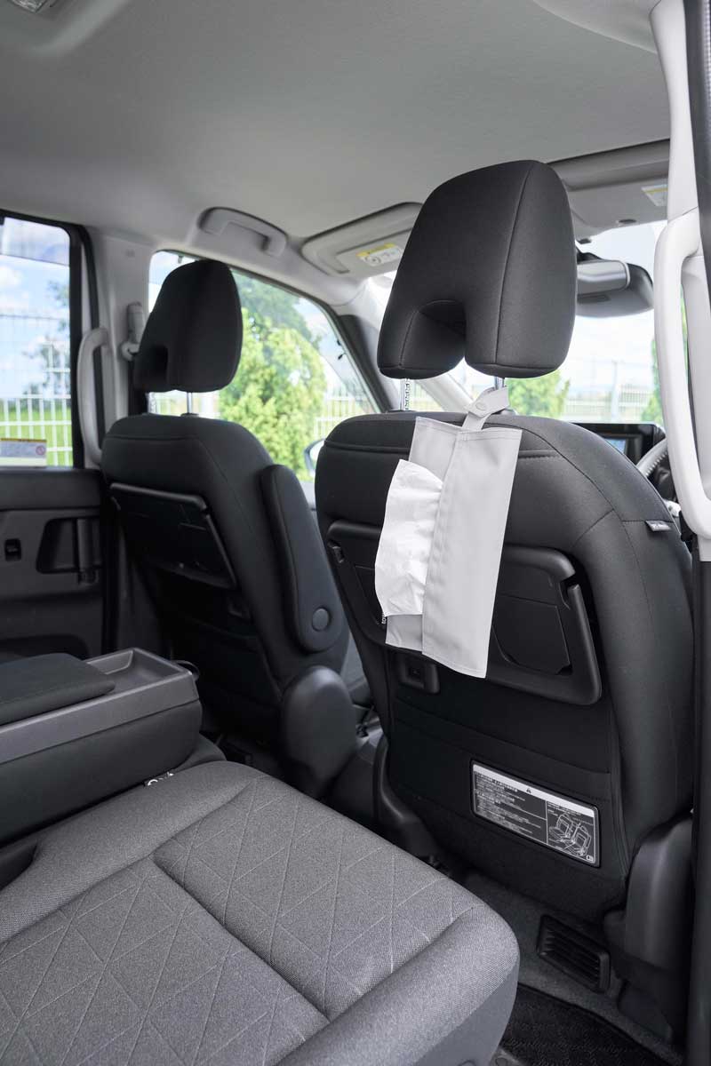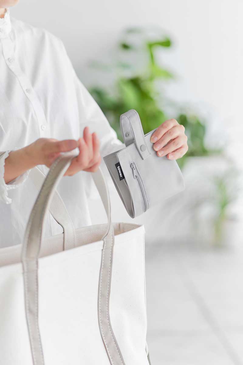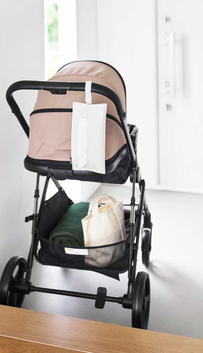 必要な分だけコンパクトに持ち運べる、くず入れ付きティッシュケースです。ソフトパックタイプのティッシュがぴったり収まり、スナップボタン付きのストラップで、ベビーカーのハンドルや車内のシート背面にも取り付け可能。