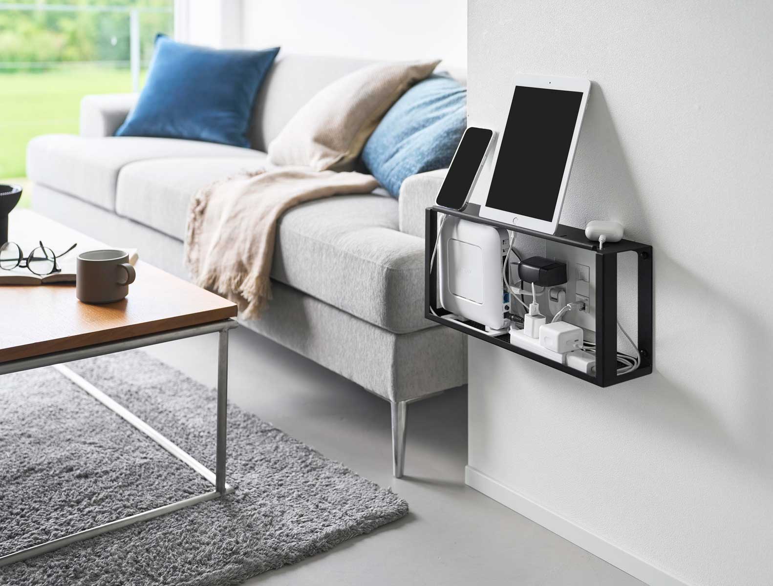 コンセントもルーターも隠せる壁付けラック。置き場所に困るルーターやケーブルを、コンセントごとすっきり隠して収納できる壁付けラックです。天面は小物置きとしても活用できます。