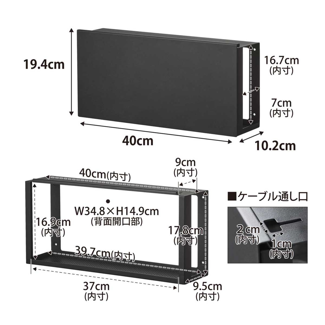 ・内寸サイズ:約W397xD95xH178mm(収納部)/約W400xD90mm(天板)/約W370xH169mm(前面開口部)/約W348xH149mm(背面開口部)/約D70xH167mm(側面開口部)/約W20xD10mm(ケーブル通し口)