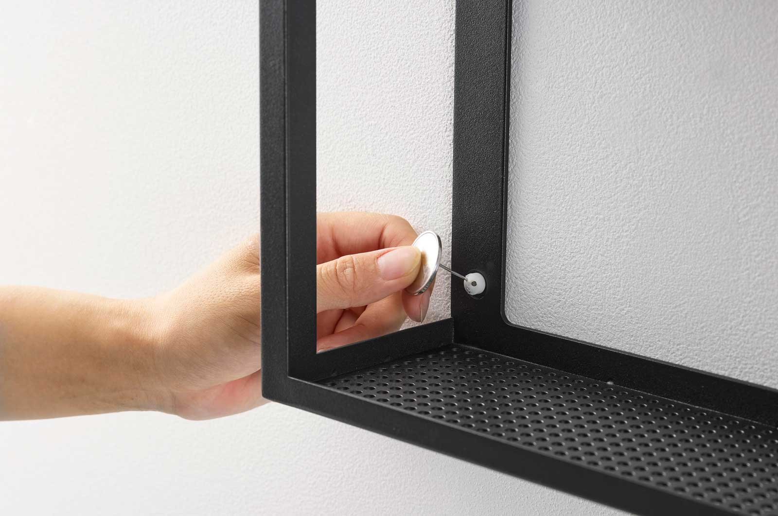 カバーは簡単に着脱でき、底面には通気穴を設けているため、熱がこもりにくい構造です。壁の穴が目立ちにくい石こうボードピンで簡単取り付け。木ネジでも取り付け可能です。
