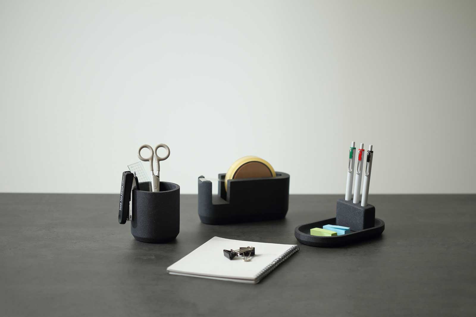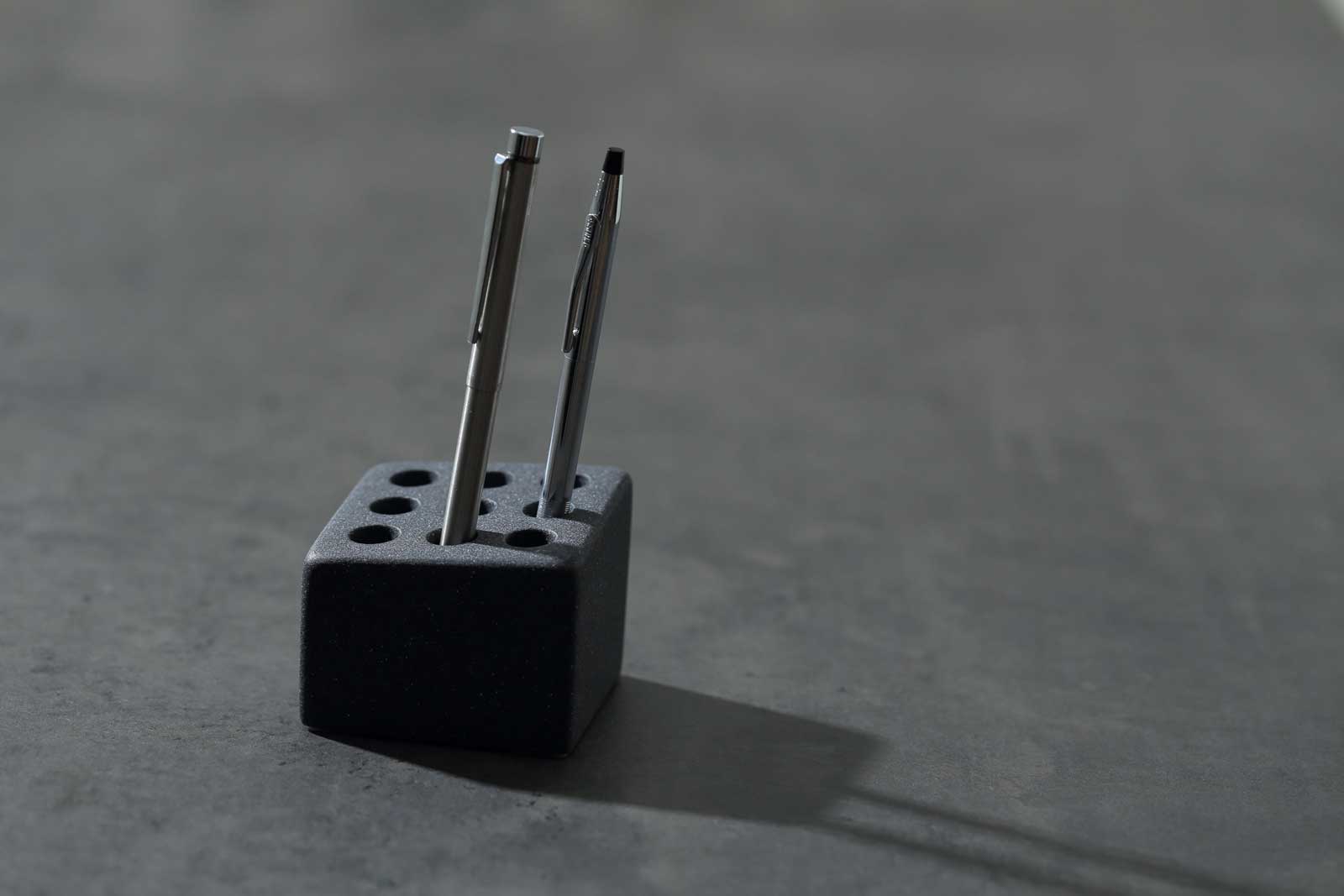 エシカルなPOLYWEAR(ポリウェア)素材。二液性で固形化するポリエステル樹脂と天然石のパウダーを混ぜて作られています。二酸化炭素の排出が少ない製法で作られた、環境にやさしいサスティナブルな製品です。質感は石の表情を感じるマット仕上げ。適度なザラつきを持ちながらも、ペンを傷つけにくい滑らかな手触りに仕上げています。