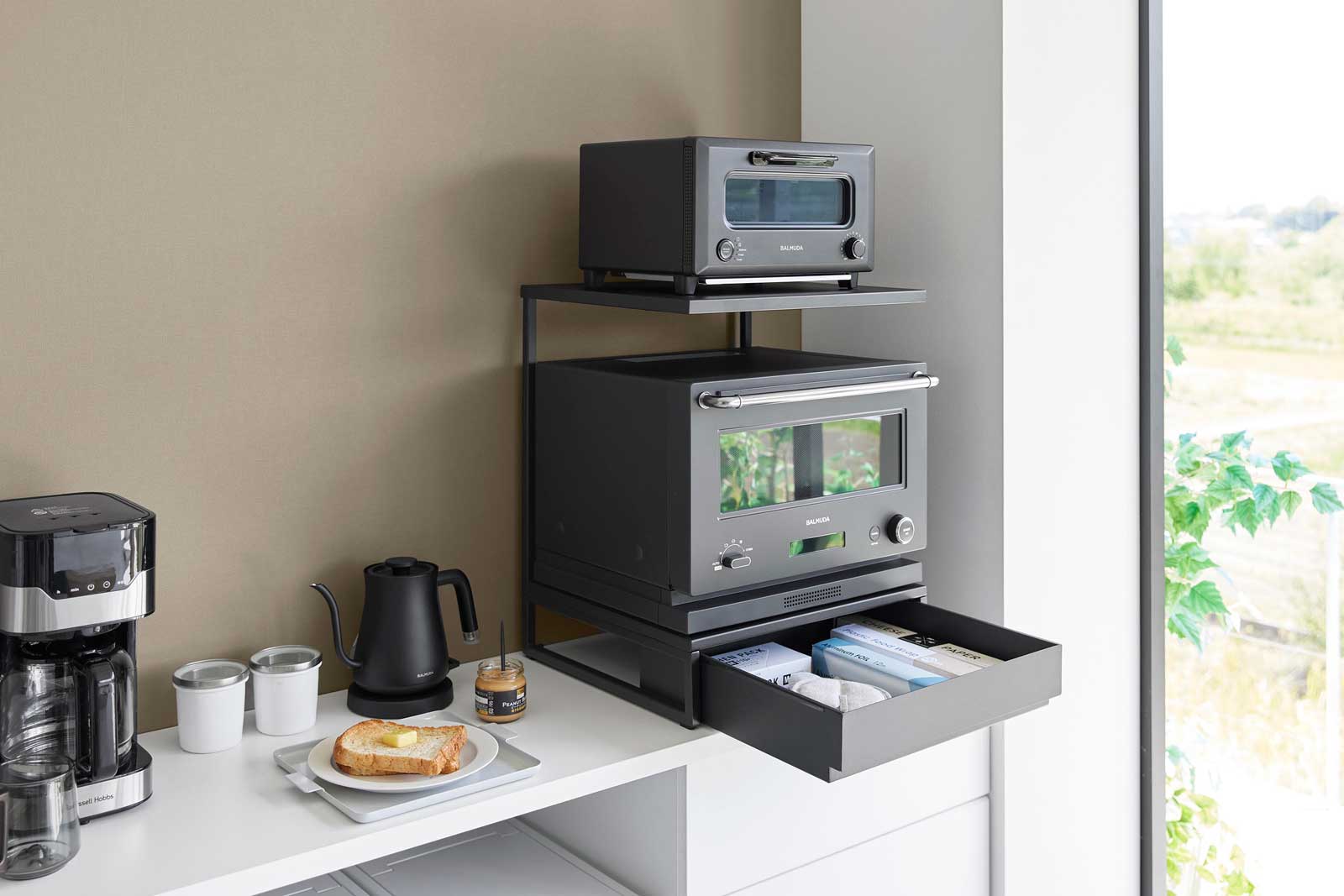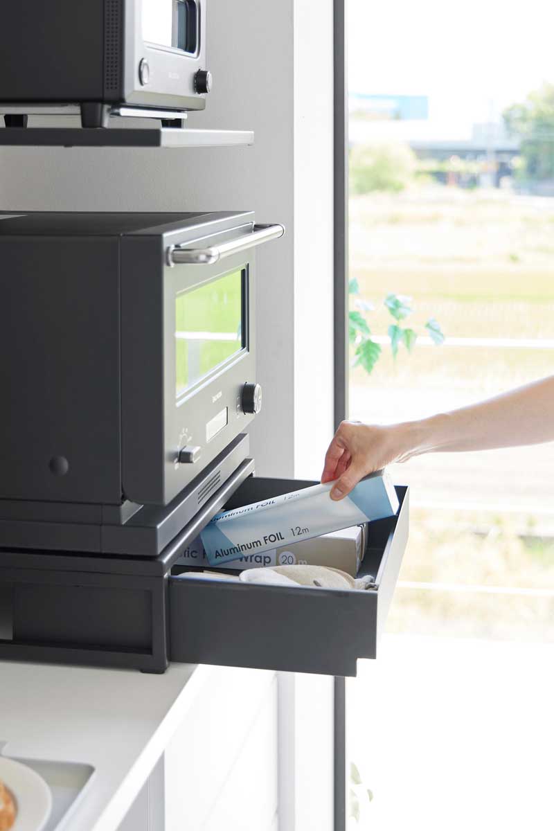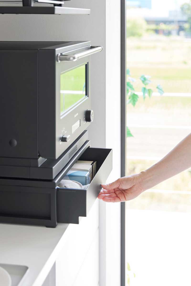 上棚にはトースター、下段の置台には電子レンジなどとキッチン家電をまとめて収納できるスチール製のキッチンラックです。一番下は高さのある引き出し付きで、電子レンジ周りのキッチン小物をたっぷり収納できます。必要な物をスムーズに取り出せて便利です。