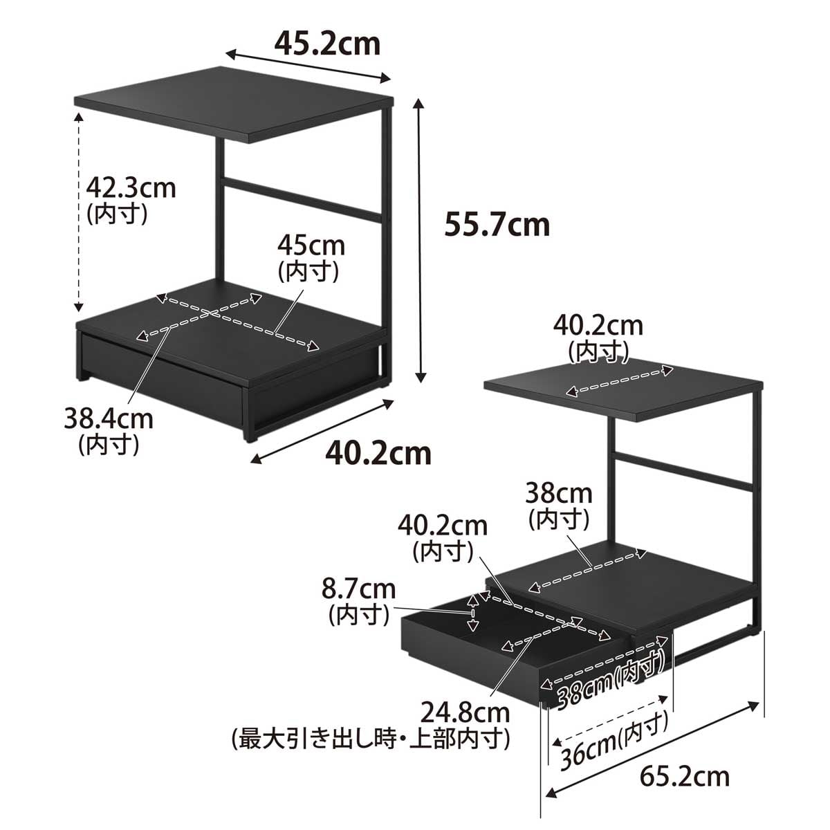 ・内寸サイズ:約W452xD402mm(上棚)/約W450xD384xH423mm(置き台)/約W402xD380xH87mm(引き出し)/約D248mm(引き出し開口部最大)