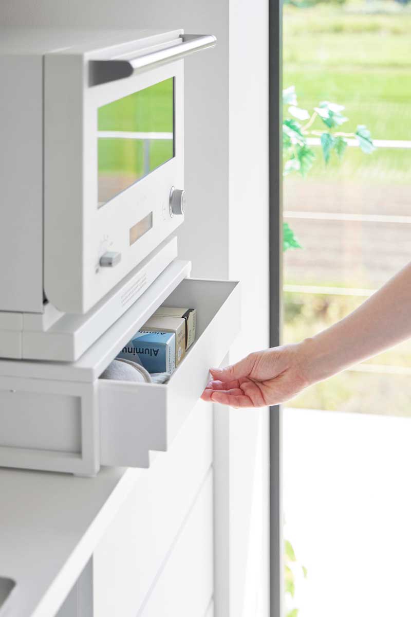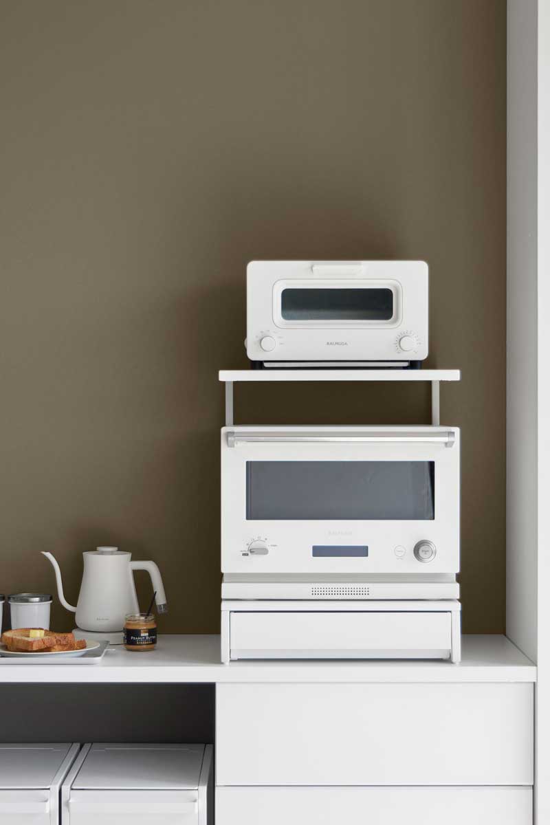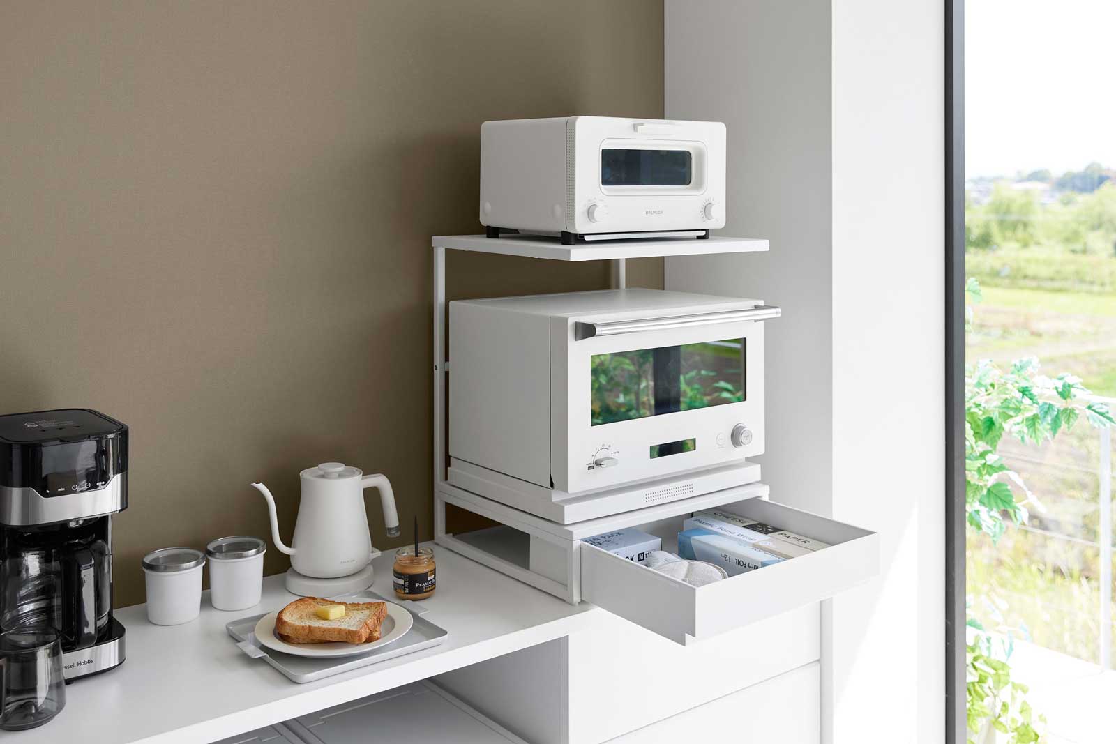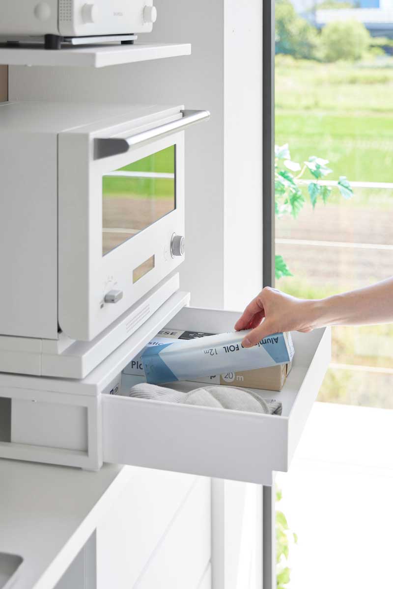 上棚にはトースター、下段の置台には電子レンジなどとキッチン家電をまとめて収納できるスチール製のキッチンラックです。一番下は高さのある引き出し付きで、電子レンジ周りのキッチン小物をたっぷり収納できます。必要な物をスムーズに取り出せて便利です。