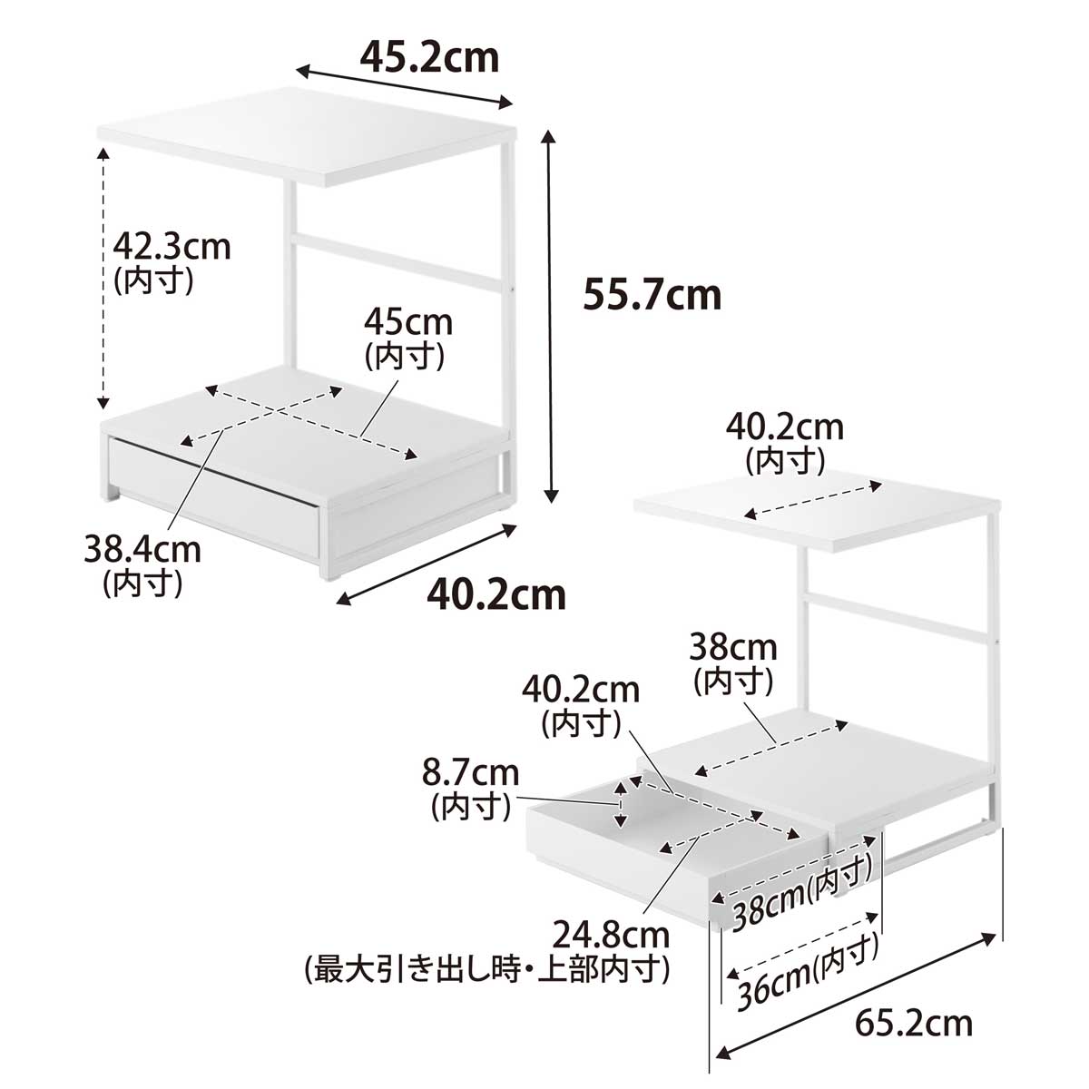 ・内寸サイズ:約W452xD402mm(上棚)/約W450xD384xH423mm(置き台)/約W402xD380xH87mm(引き出し)/約D248mm(引き出し開口部最大)
