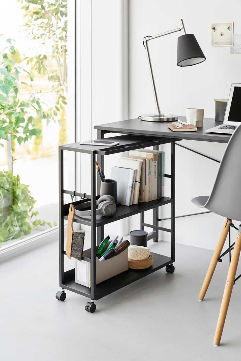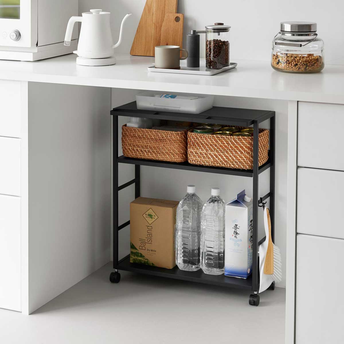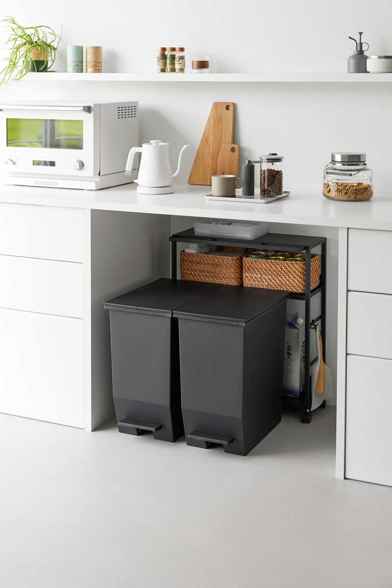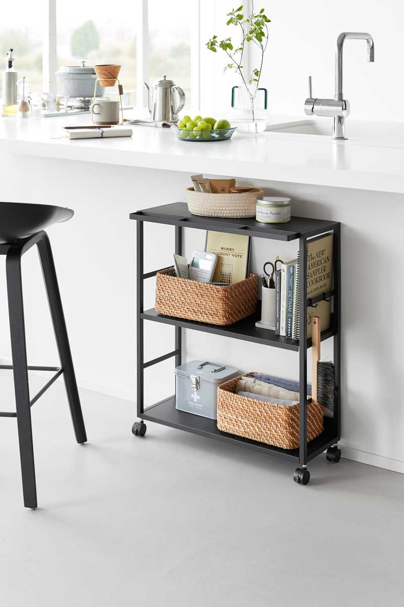 ゴミ箱裏やカウンターまわりのスペースを有効活用できる、奥行き20cmのスリムワゴンです。中段の棚板は3段階で高さ調節ができ、収納物に合わせて無駄なく使えます。食料品や調味料のストックを、ゴミ箱裏に目隠ししながらまとめて収納可能。キッチンカウンター手前のすき間収納としてはもちろん、作業デスク下のワゴンとしてもおすすめです。