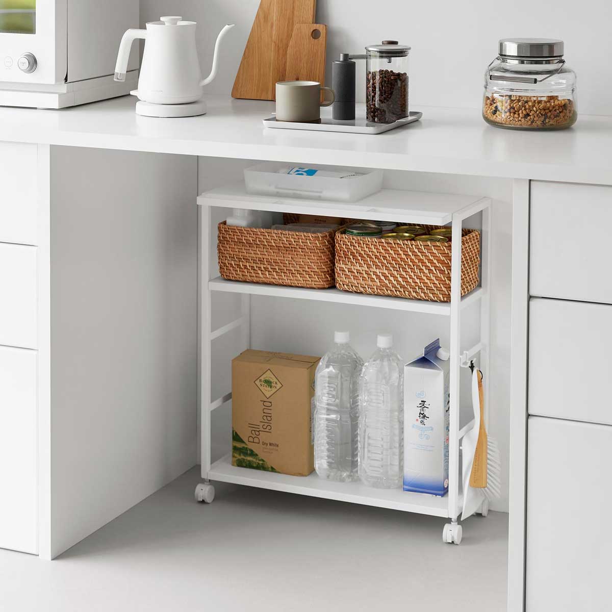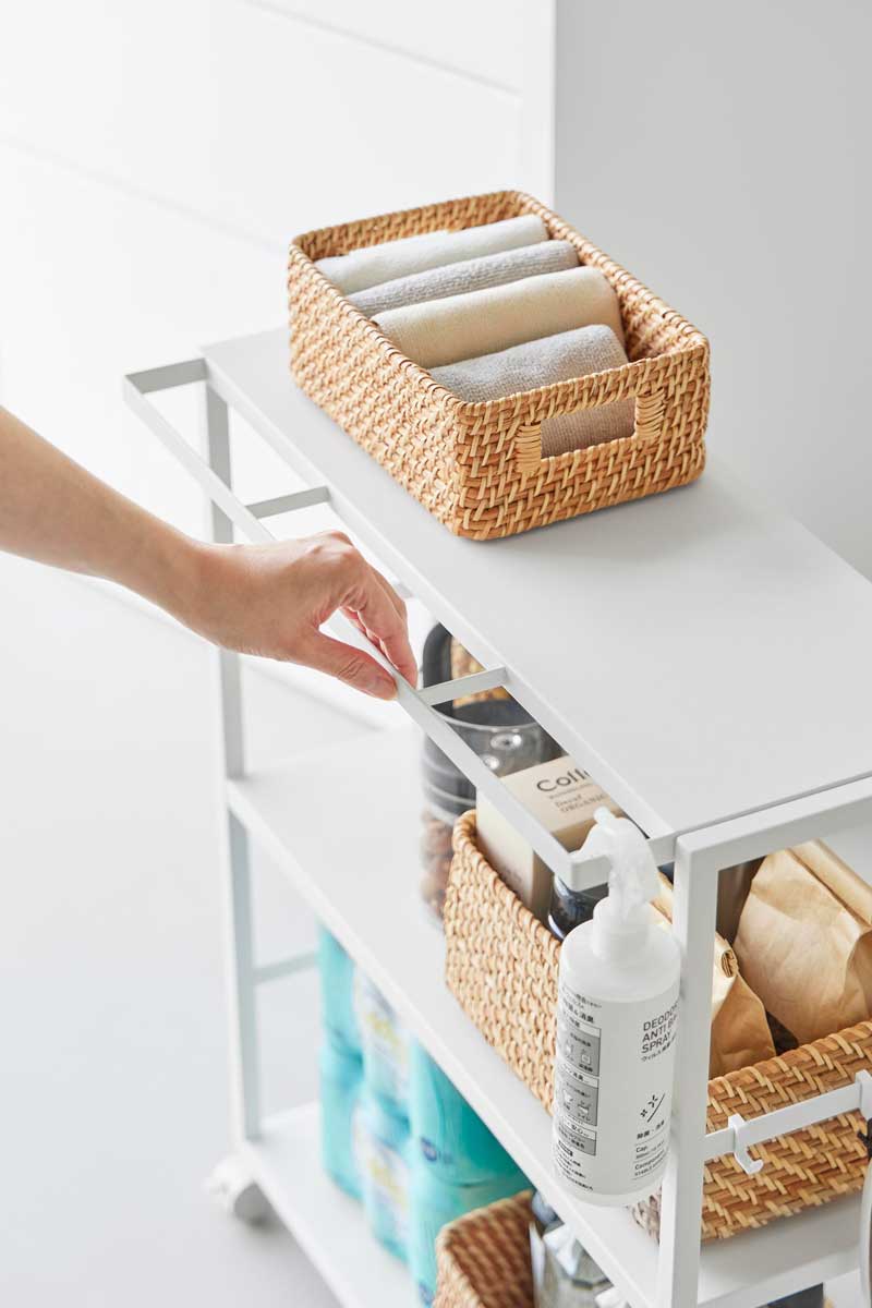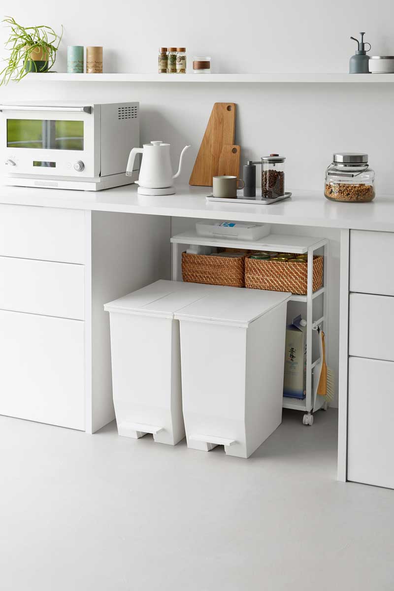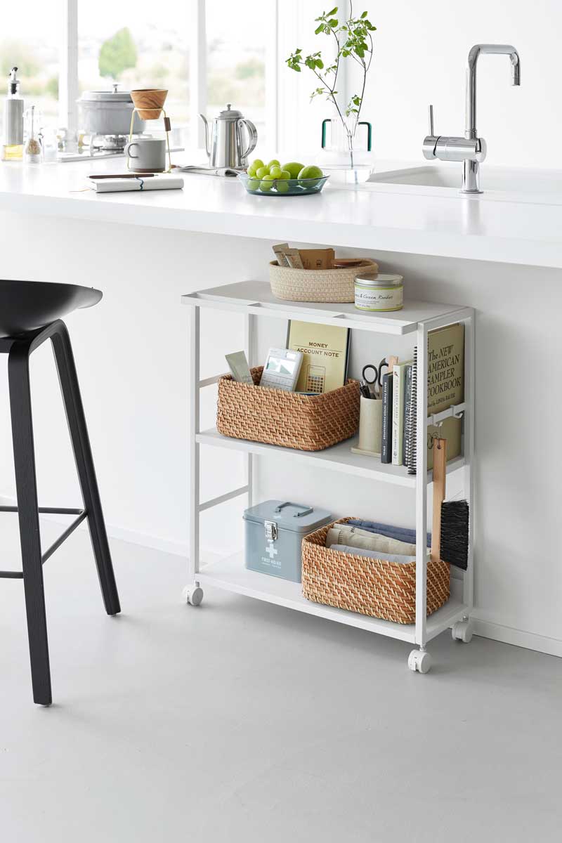 ゴミ箱裏やカウンターまわりのスペースを有効活用できる、奥行き20cmのスリムワゴンです。中段の棚板は3段階で高さ調節ができ、収納物に合わせて無駄なく使えます。食料品や調味料のストックを、ゴミ箱裏に目隠ししながらまとめて収納可能。キッチンカウンター手前のすき間収納としてはもちろん、作業デスク下のワゴンとしてもおすすめです。