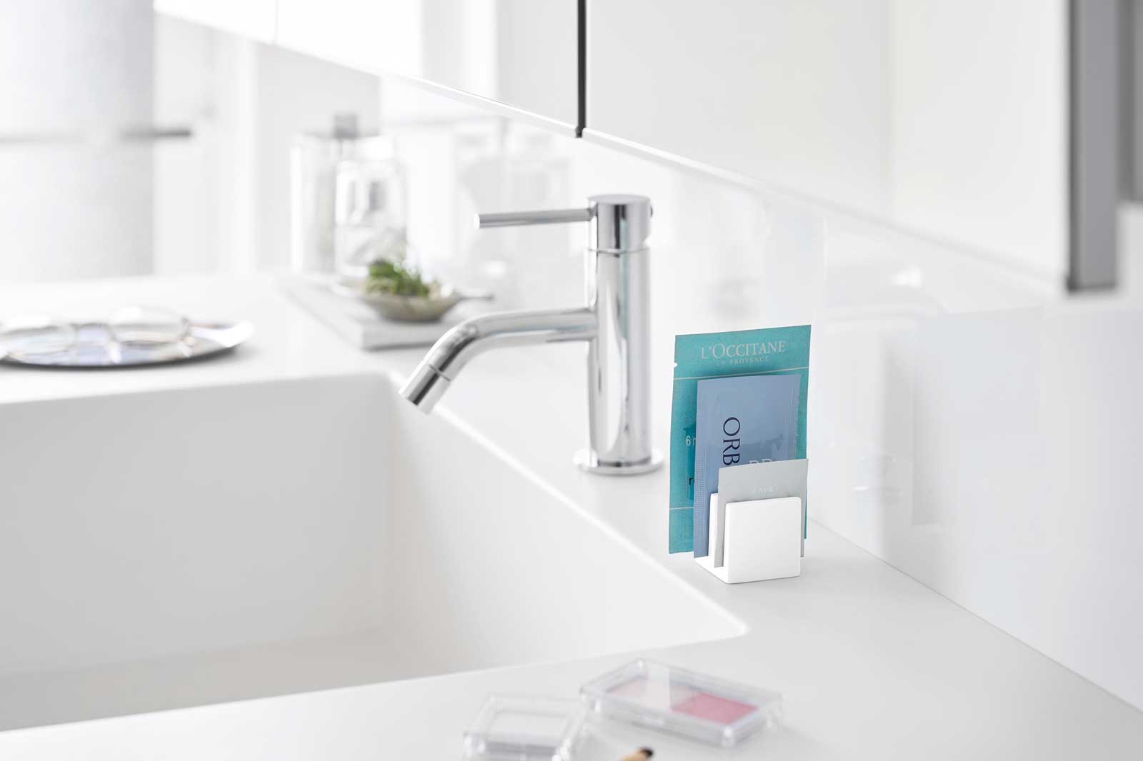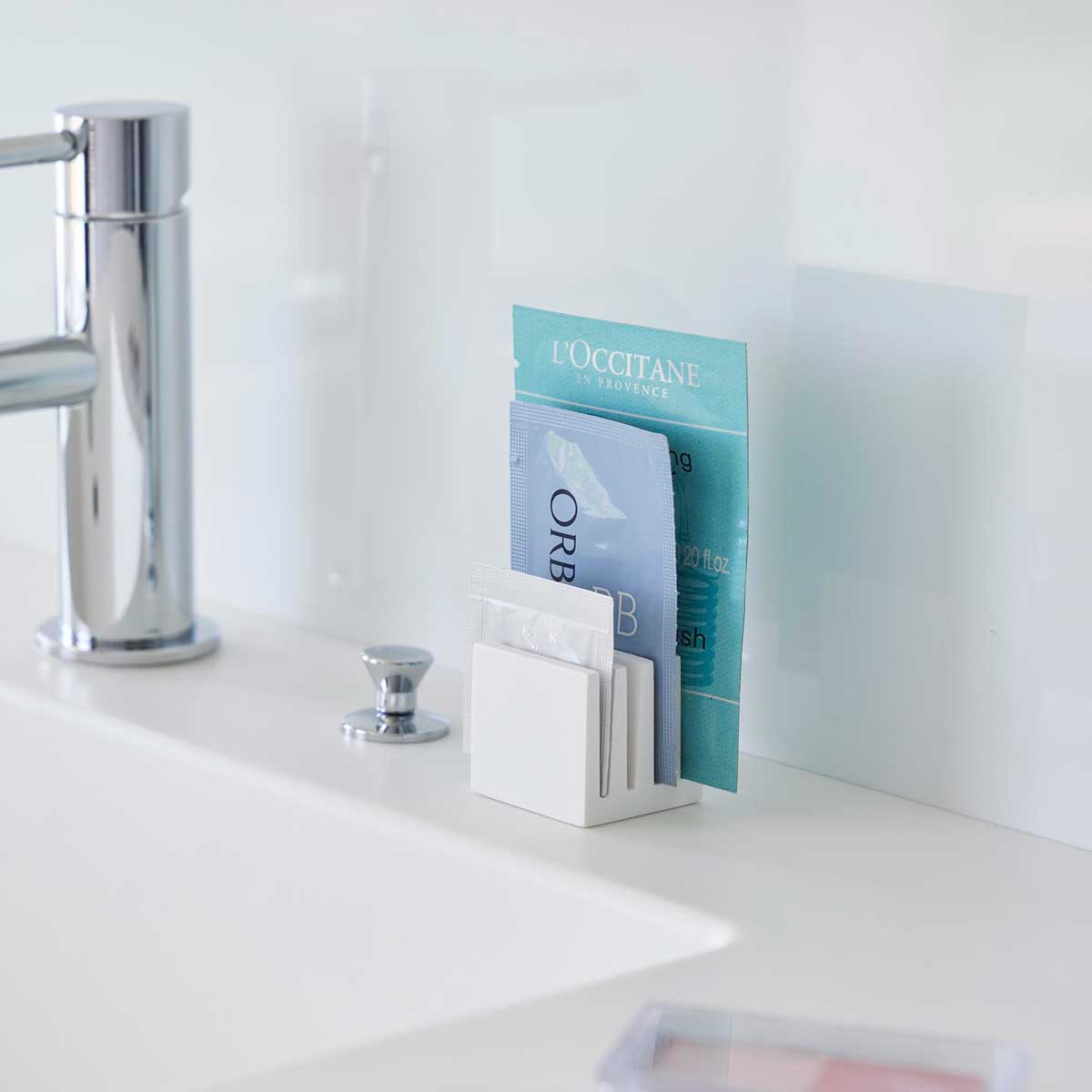 サンプルパウチを立ててすっきり収納。化粧品サンプルをコンパクトに整理できるパウチスタンドです。戸棚中にもすっきり収まるコンパクトサイズです。