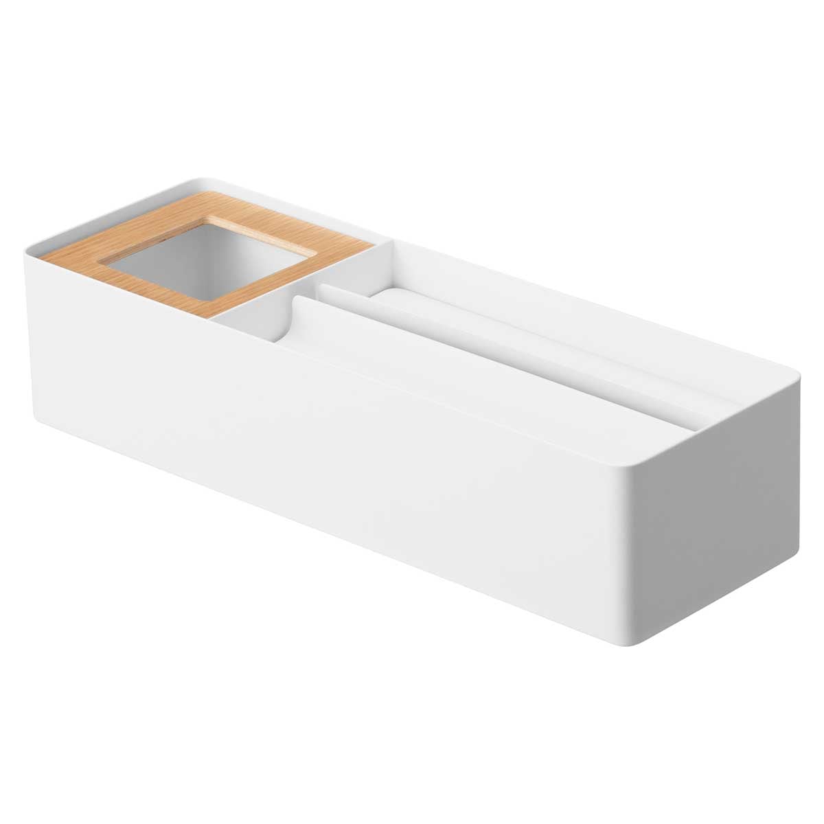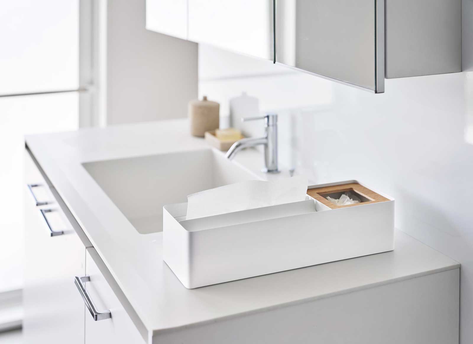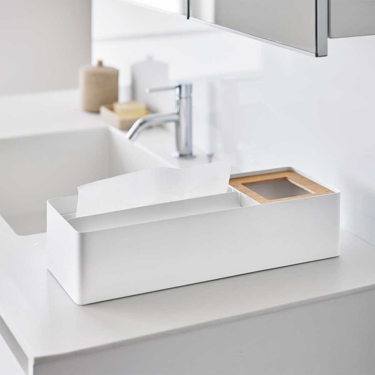 ペーパータオルとゴミ箱をひとまとめに。ホテルライクな置き型オーガナイザーです。ゴミが捨てやすいインナーボックス付きで、使ったその場でサッと捨てられる便利な一体型設計。ペーパータオルはもちろん、箱ティッシュやソフトパックにも対応しています。