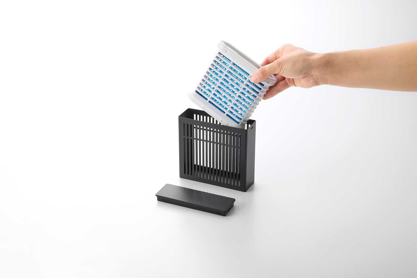 置き型蚊取りは専用容器ごと入れるだけで簡単に設置可能。上下を逆さにすることでON/OFFを切り替えられ、蓋を上にした状態をOFF、下にした状態をONなど、お好みで基準を決めておくことで、使用状態をひと目で確認できます。
