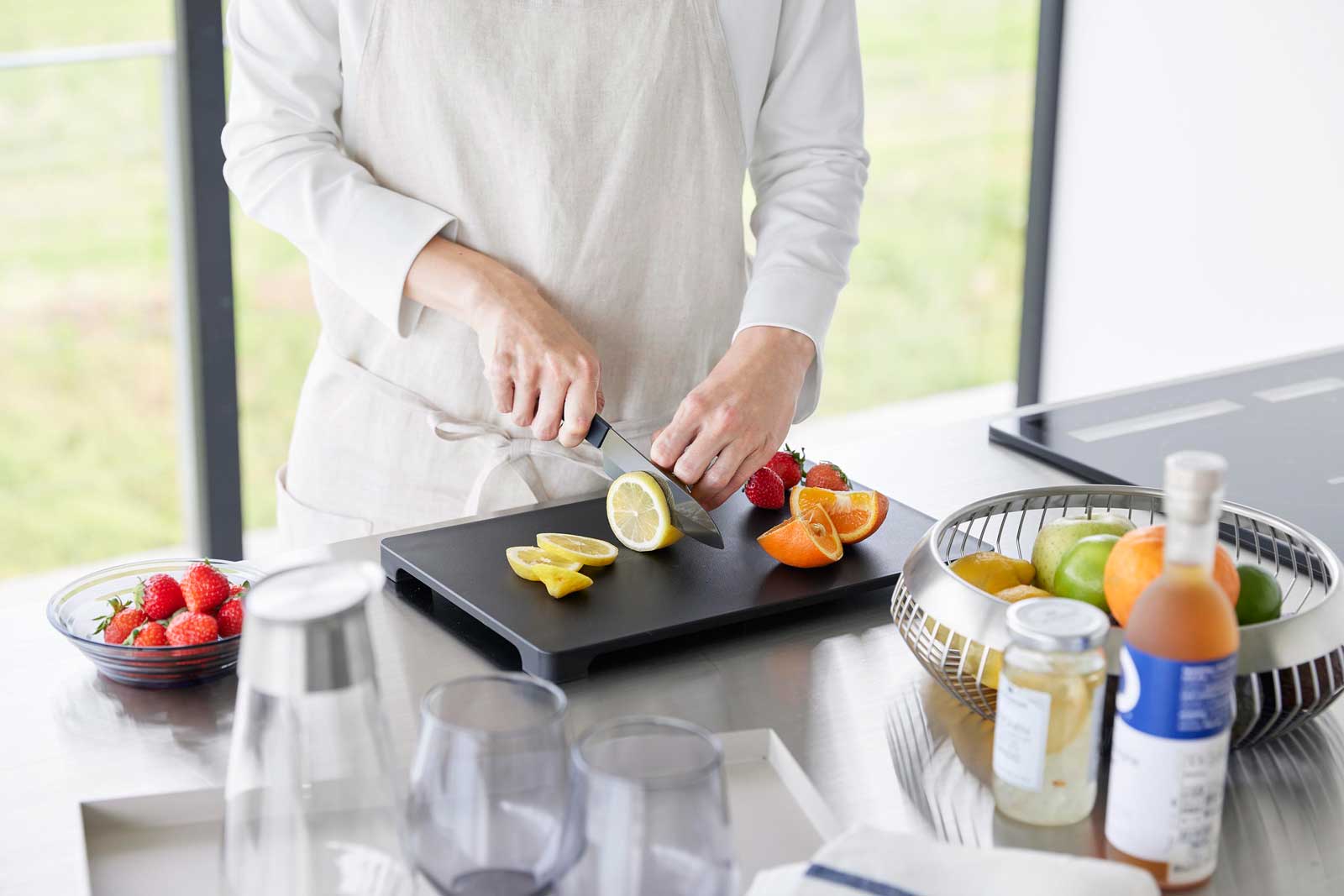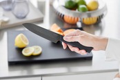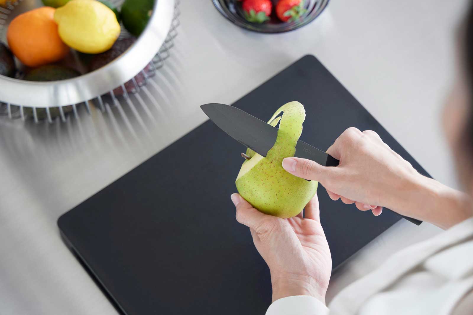 刃には、超高圧・高密度成形焼結による純ジルコニアセラミックを採用。刃の密度が高く、金属よりも摩耗しにくいため切れ味が長持ちし、錆びに強く金属アレルギーの心配もありません。酸やアルカリにも強く、漂白除菌や食洗機にも対応しています。V字形状の二段刃により、食材への抵抗が少なく、滑らかに切れるのが特徴です。