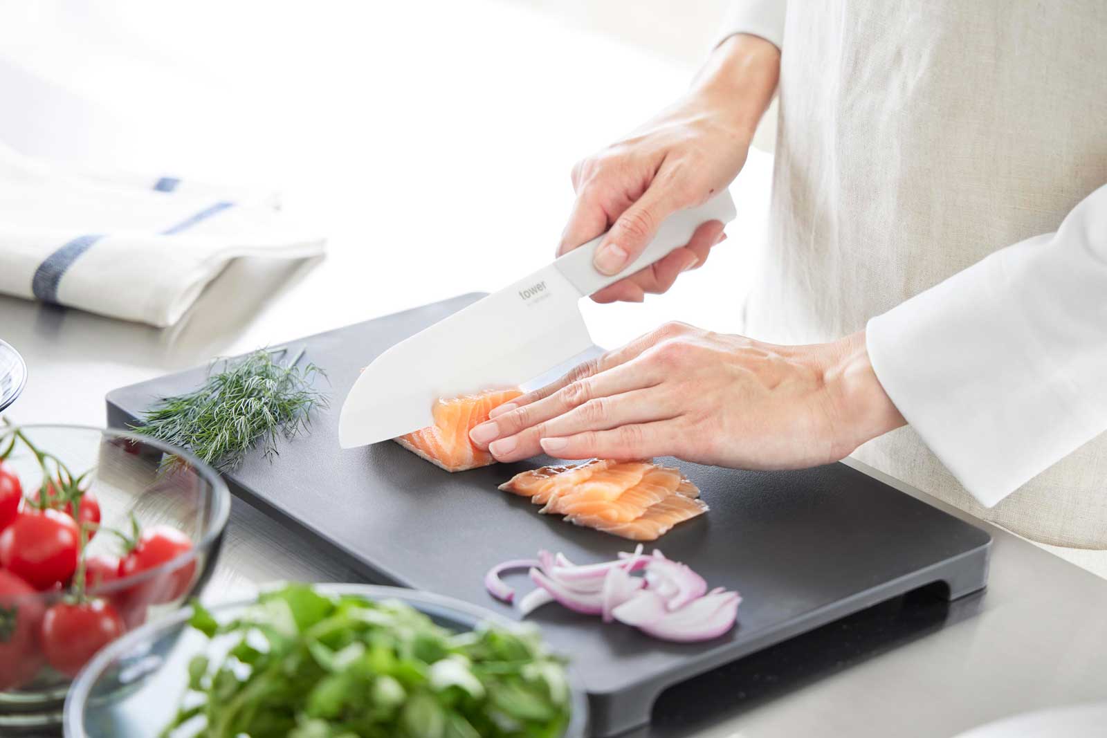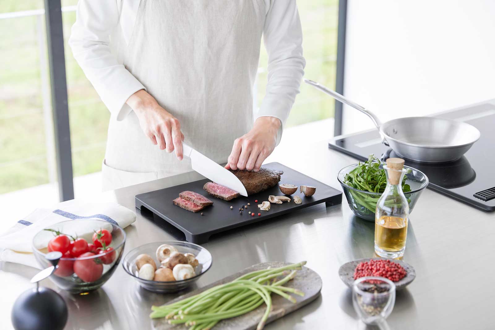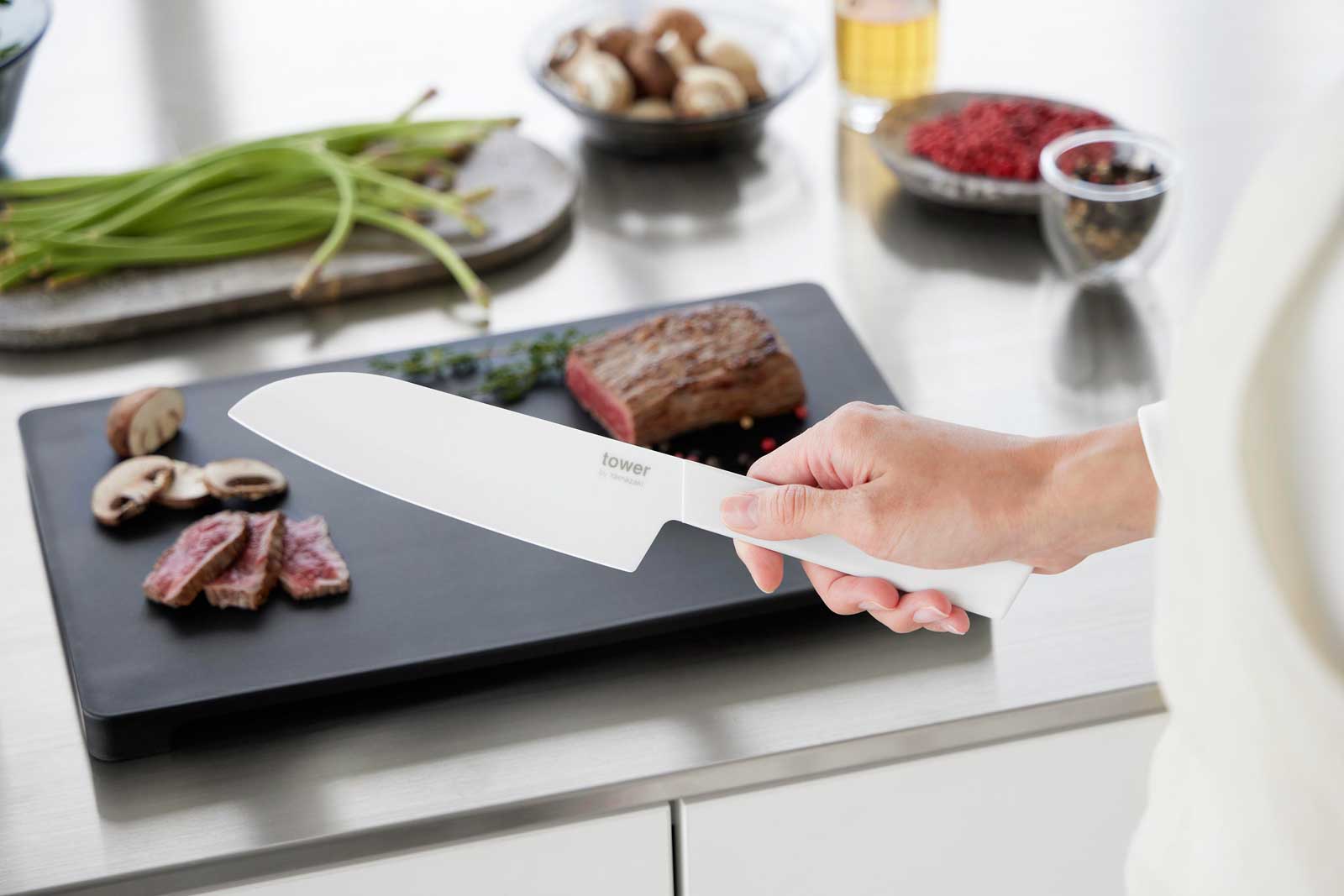 幅広い食材に使える、刃渡り16.5cmの三徳ナイフです。トマトなどの繊細な食材も、簡単に軽く切れるのが特長。手にしっかり馴染むハンドルで、長時間使っても疲れにくい設計です。刃には、超高圧・高密度成形焼結による純ジルコニアセラミックを採用。酸やアルカリにも強く、漂白除菌や食洗機にも対応しています。
