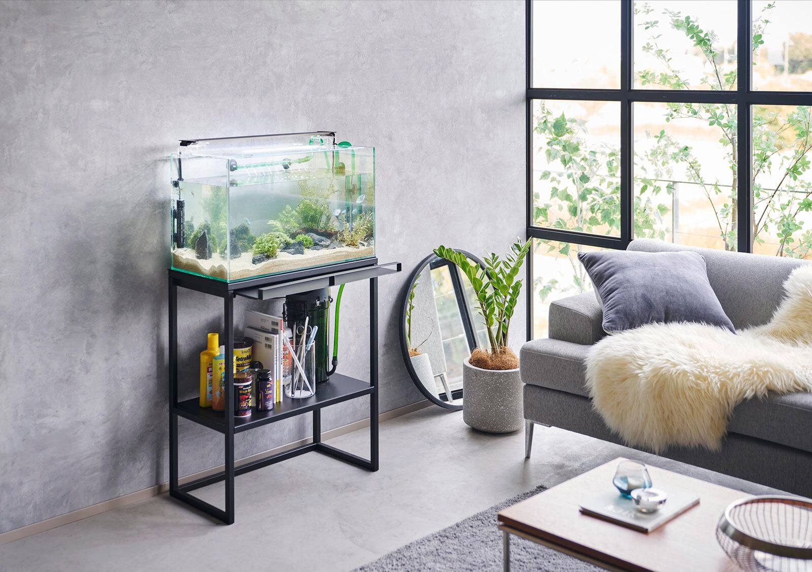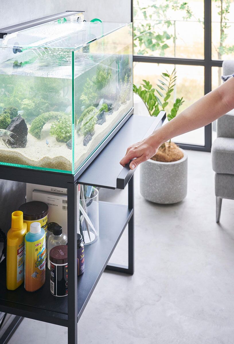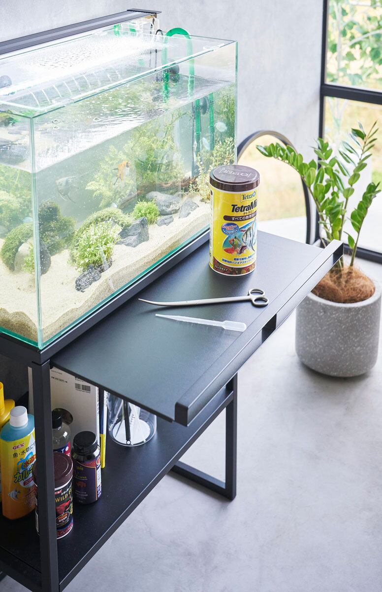 散らかりがちな飼育備品を隠して60cmサイズの大型水槽をディスプレイできるラックです。下にはフィルターやエサなどをまとめて収納できます。扉がついていて目隠しできるので生活感を感じさせません。