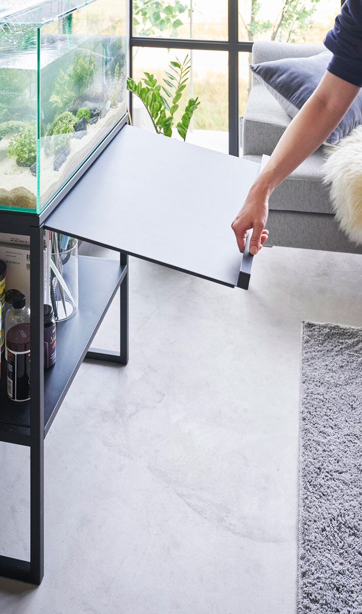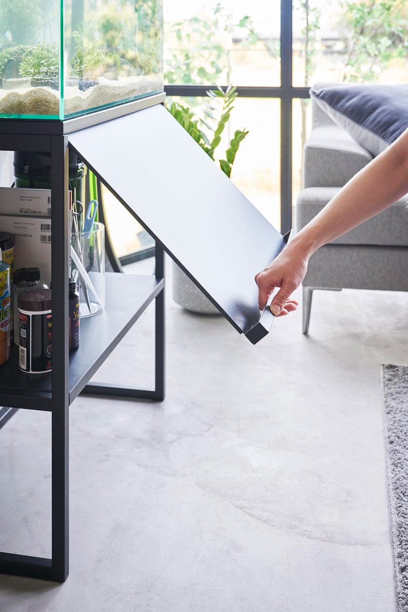 目隠しできる扉はラックの中に収納することができ、開けたまま固定することも可能です。扉にはちょっとした作業時の備品を仮置きすることもできます。60cmサイズの大型水槽用ラックです。