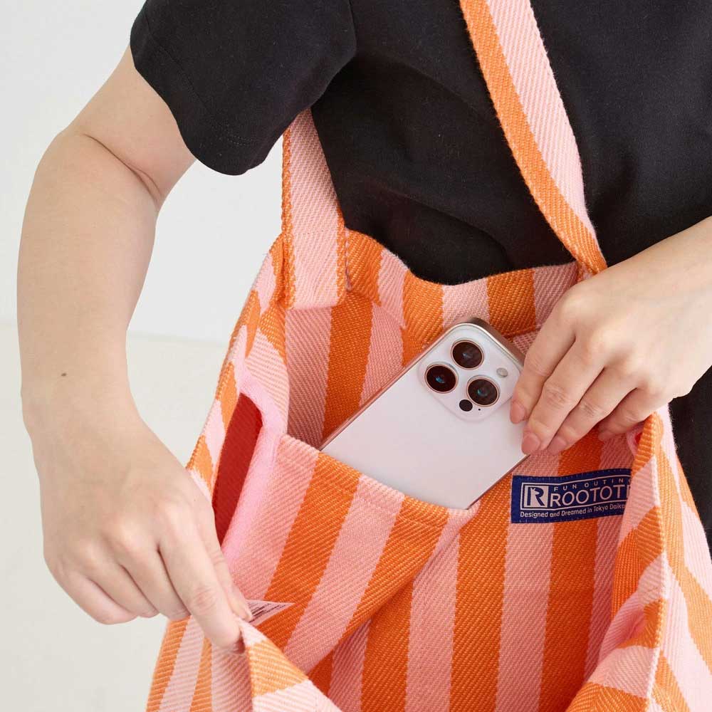 安定感のあるワイドな丸底で、驚くほどの収納力。A4ファイルや13インチのノートパソコン、お財布、ポーチ、ランチボックス、ストールまでらくらく収納。ボトルホルダーもあるので、ボトルや折りたたみ傘もすっきり収納。バッグの中で倒れる心配もありません。デザインのアクセントでありながら、ROOTOTEならではのルーポケット。よく使うスマホやリップが、サッと取り出せてスムーズ。