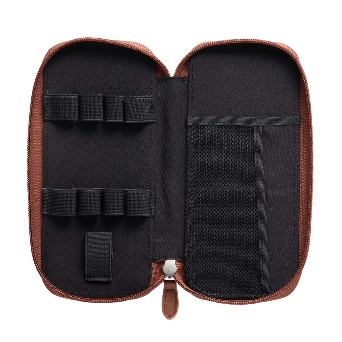 LIFT+ラウンドジップペンケースは、LIFT+世界観を損なわないデザイン。内部に伸縮するゴムループを使用した4本のペン差し、消しゴム収納、右側に3つの収納ポケットを備えた、シンプルかつ実用設計のペンケースです。
