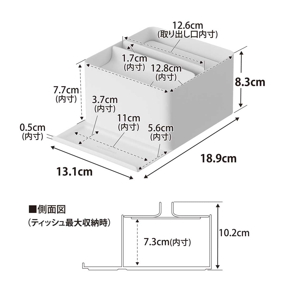 ・内寸サイズ:約W128xD128xH73mm(収納部)/約W126xD17mm(ティッシュペーパー取り出し口)/約W110xD37mm(トレー部)