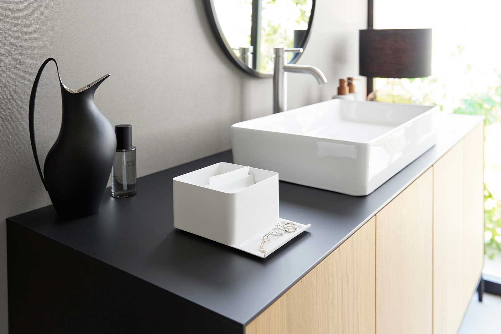 トレー部分は、アクセサリーなどの小物を一時的に置けるスペースとしても便利です。「インナーボックス付き洗面室用ゴミ箱 タワー(別売)」と並べて配置すれば、洗面まわりをすっきり統一感のある空間に整えられます。